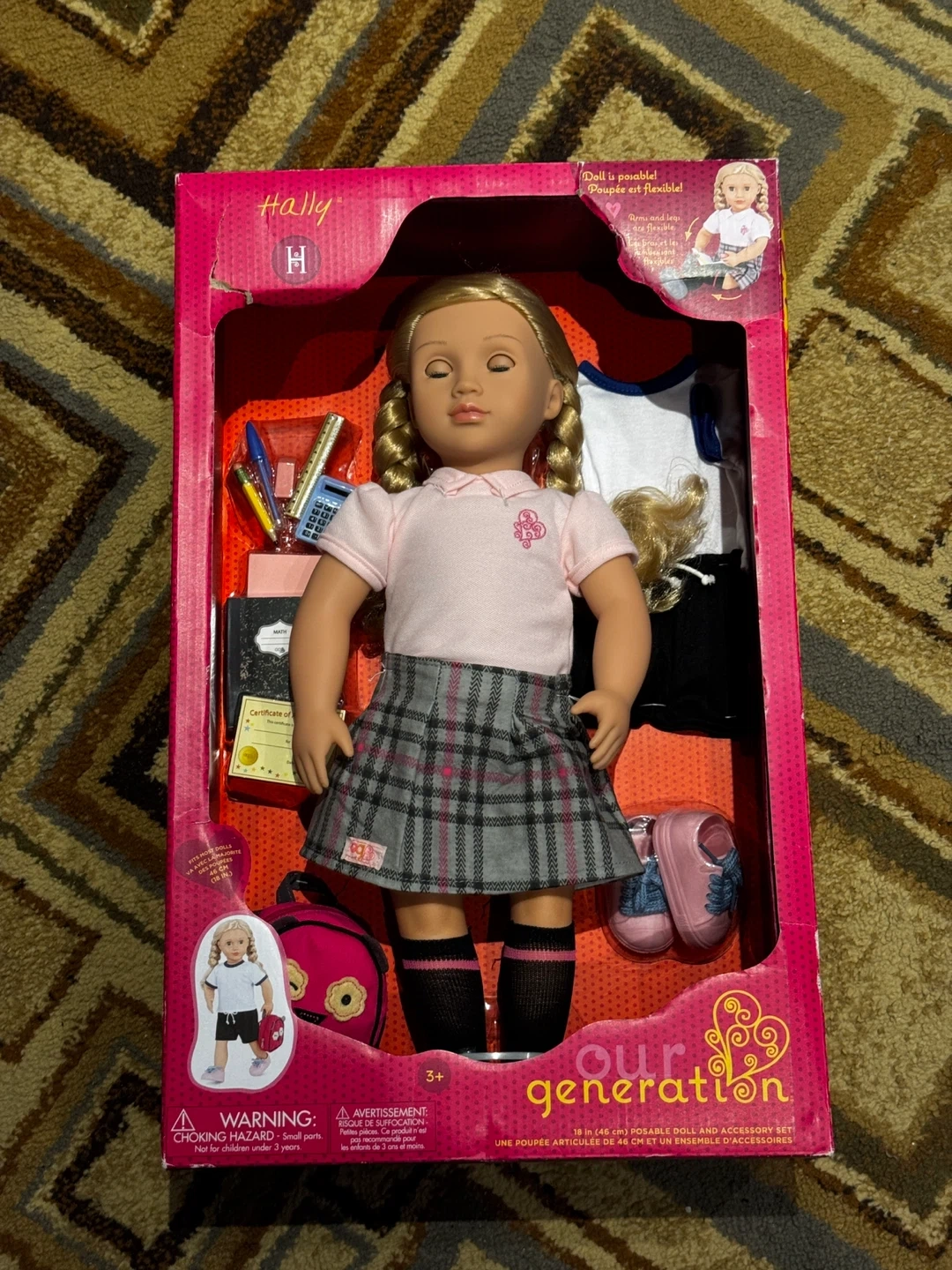 This Our Generation Hally doll comes in a gift box with accessories. The doll is 18 inches tall and posable, with flexible arms and legs. It includes school-themed accessories like a backpack, calculator, pens, and books.
