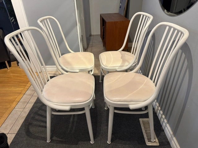 Vintage charm meets modern utility with this set of four Drevounia dining chairs, hailing from Czechoslovakia. The chairs feature a sleek, white painted finish and are ready to bring a touch of retro flair to your dining space. They are in used condition, showing signs of their age, but are sturdy and ready for years of service. Key details: Brand: Drevounia, Origin: Czechoslovakia, Finish: White paint. Acquiring these chairs is a steal of a deal; a chance to own a piece of history without breaking the bank! These chairs are a conversation starter. If the ad's still up, the chairs are available!