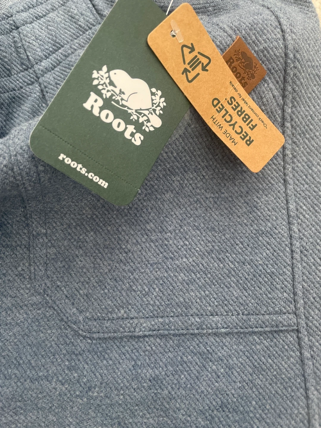 These are Roots kids' blue pants in size 8. They're made with recycled fibres. The pants have a comfortable, casual design.