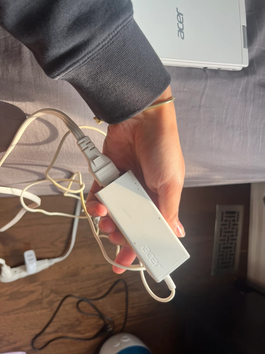 White Acer Chromebook laptop with charger included. It's a portable device for everyday tasks. Good for school or work! Also comes with a working charger!