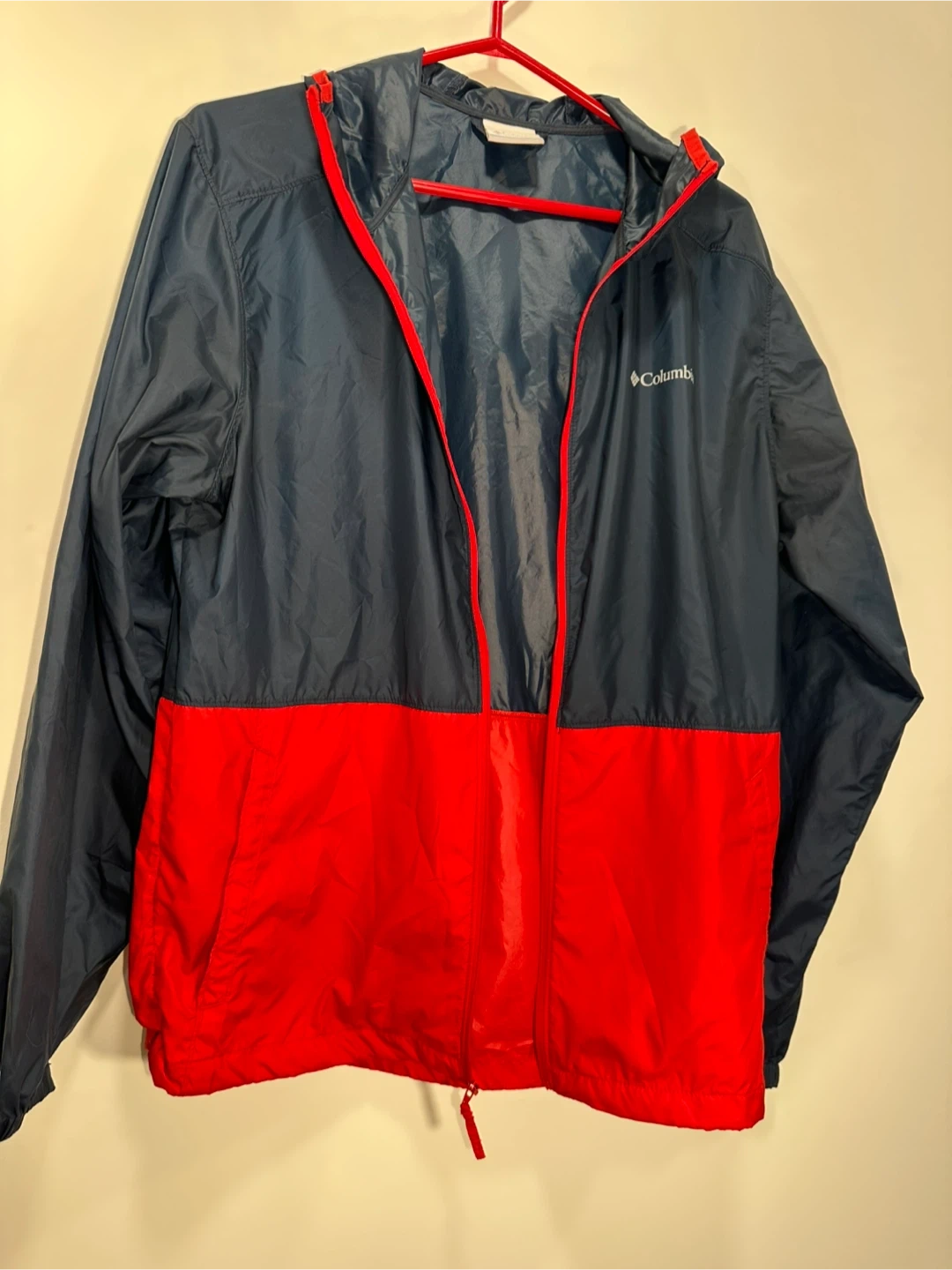 This is a Columbia Sportswear Company windbreaker jacket. It's a size small and features a navy blue and red colour blocking design. It's lightweight and suitable for outdoor activities.