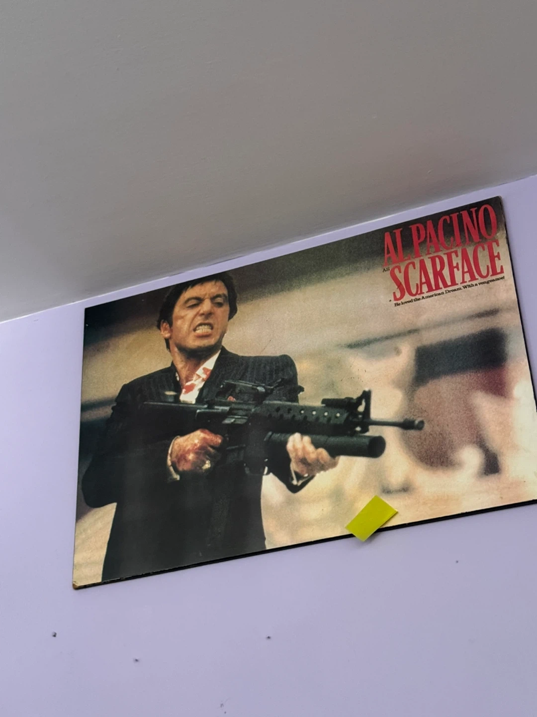 This is a poster from the classic movie Scarface, featuring Al Pacino. It's a great piece for any film enthusiast's collection. The poster depicts the iconic scene with Tony Montana.