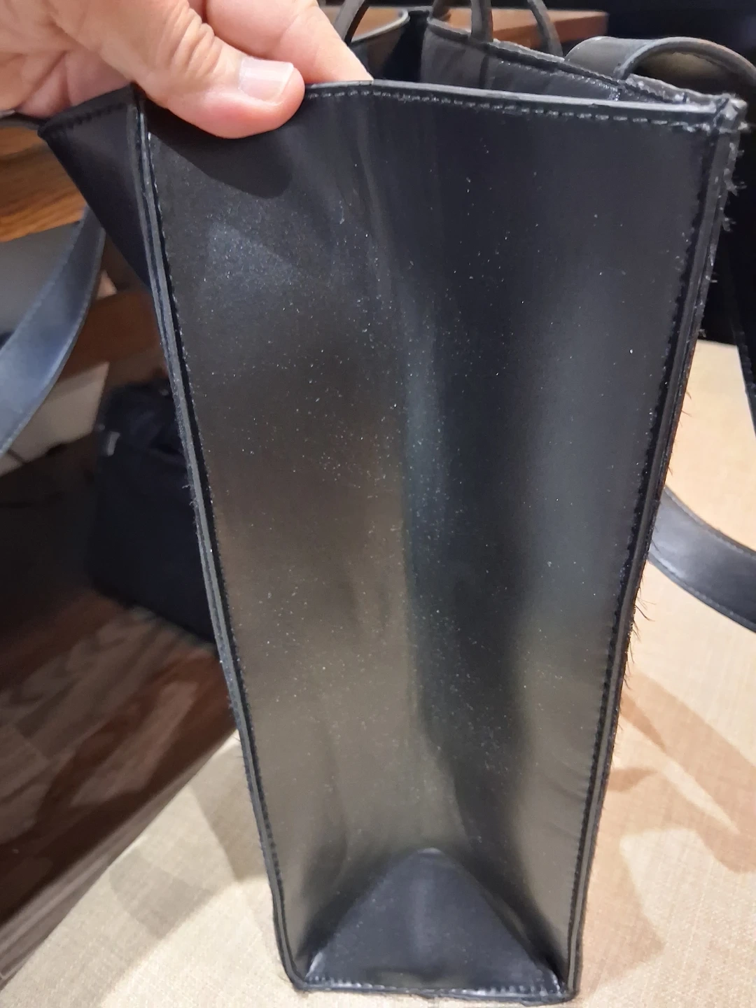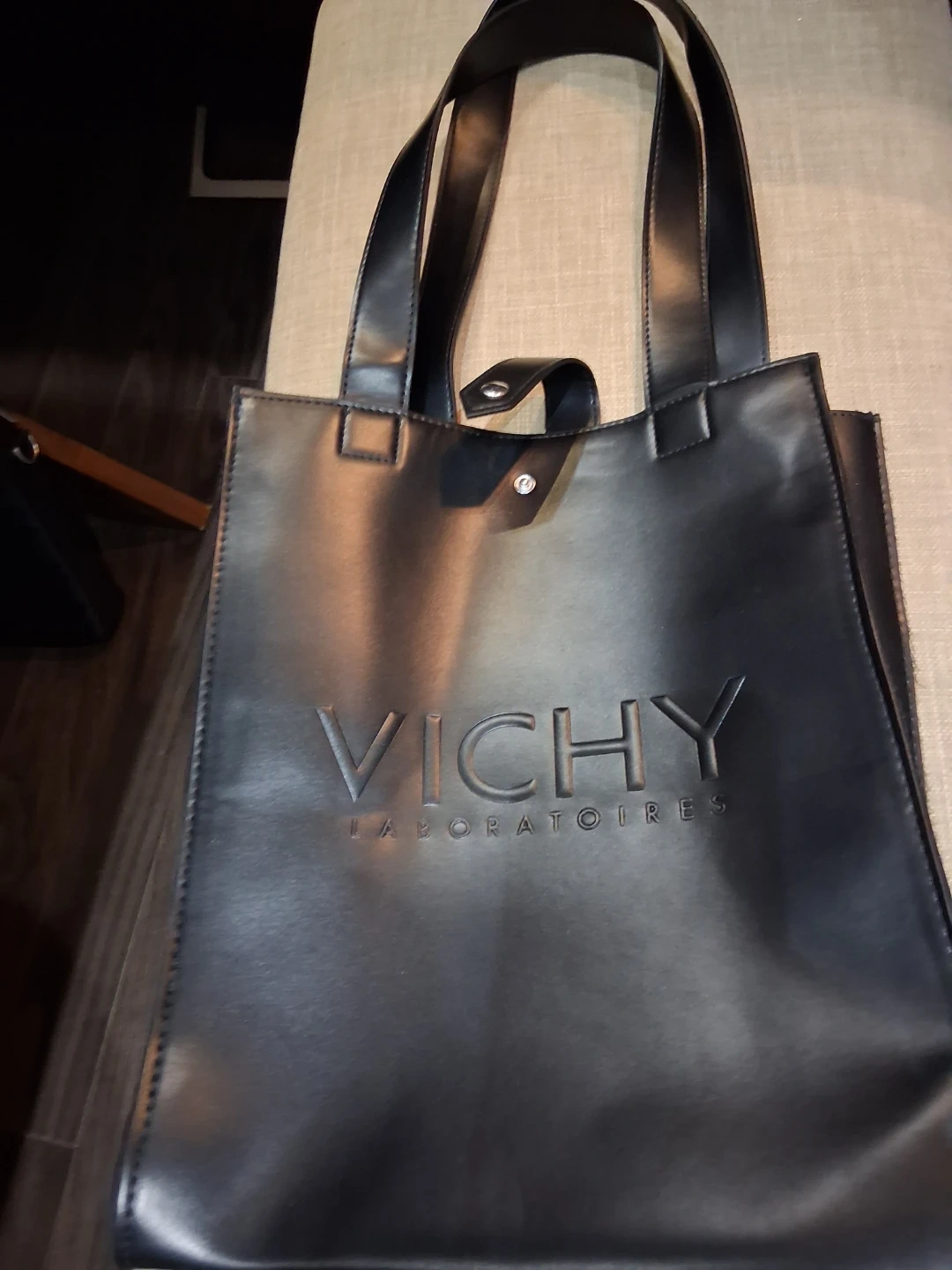 This is a black tote bag from Vichy Laboratoires. It's made of faux leather and has a snap closure. Perfect for carrying essentials!