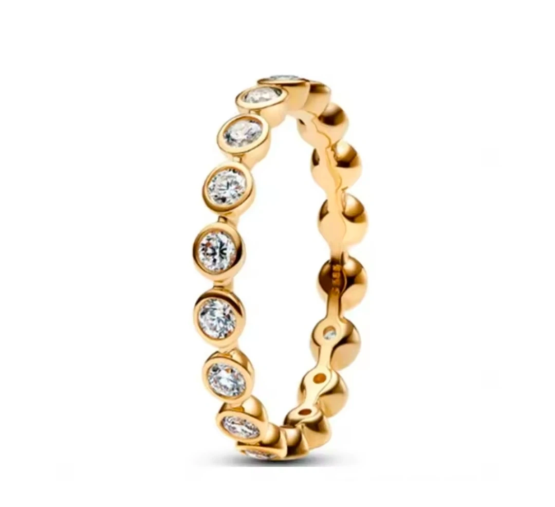 A beautiful gold-tone eternity ring with clear crystals. Its delicate design makes it a lovely addition for everyday wear. This ring is size 6 and crafted from sterling silver 925