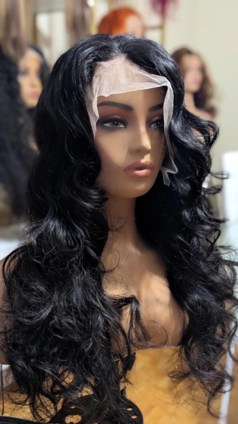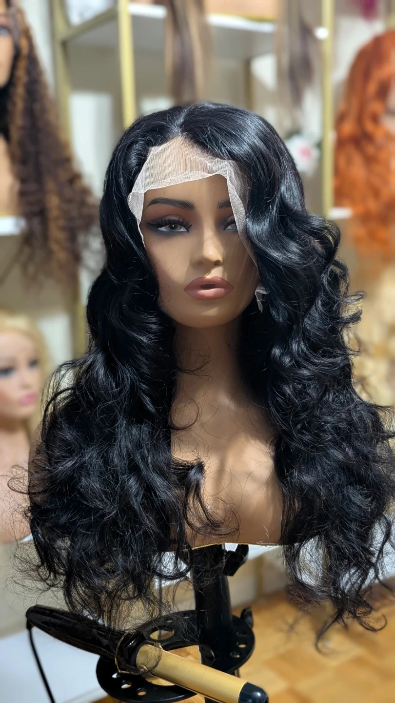 This is a beautiful black lace front wig with loose waves. It's made with human hair for a natural look and feel. It has a natural hairline and is ready for styling!