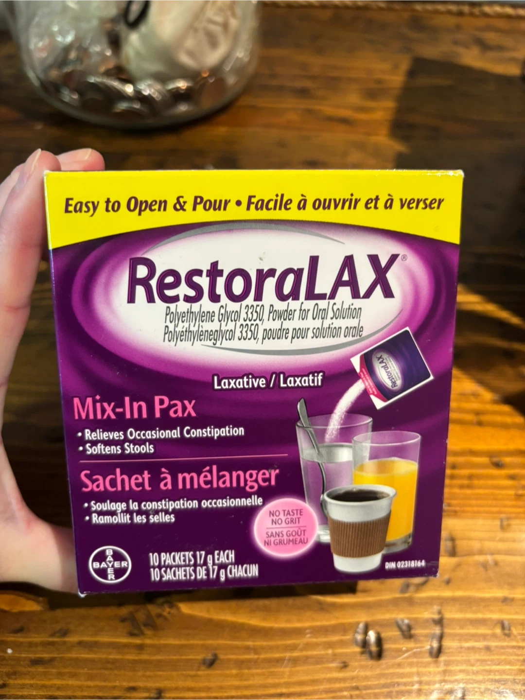 Relieves occasional constipation and softens stools. Includes 10 packets, each 17g. Expiry date is October 2026.