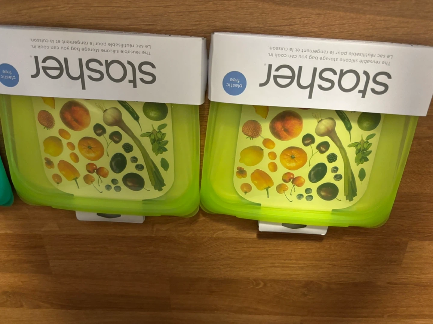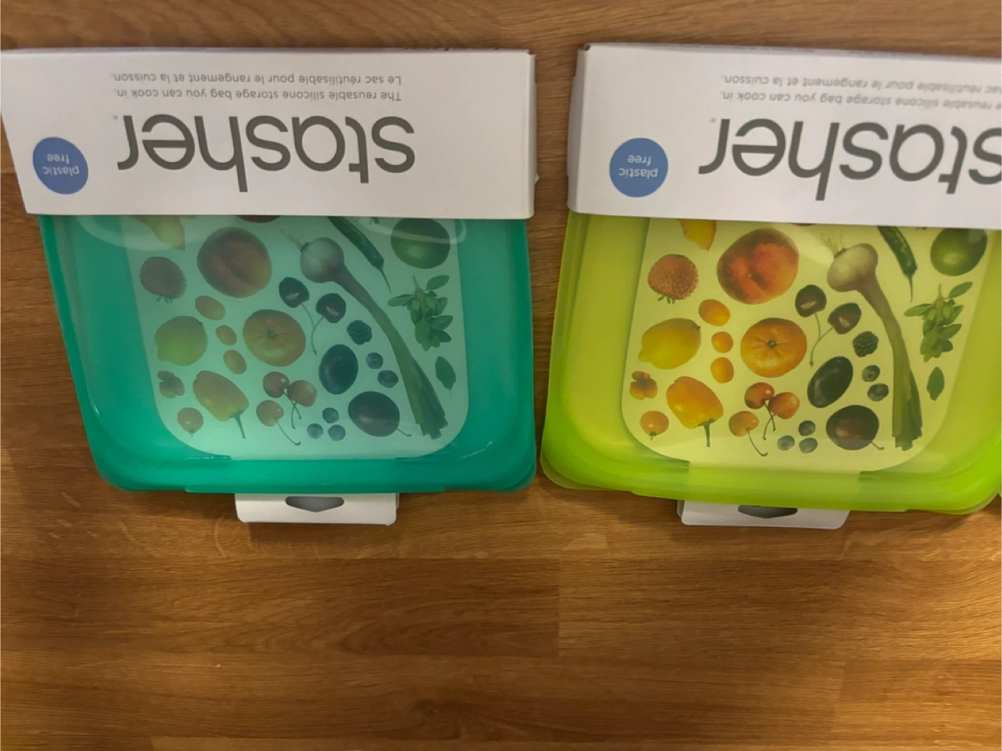 These are three Stasher reusable silicone storage bags. They're great for storing food, cooking, or organizing. Made of durable silicone.