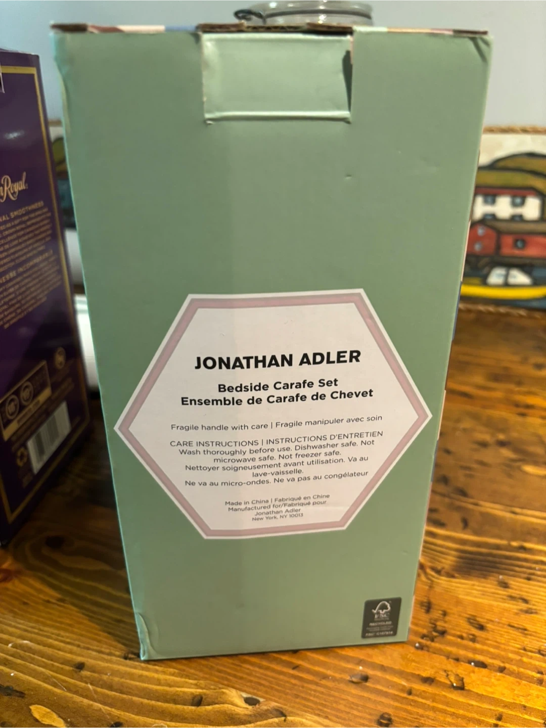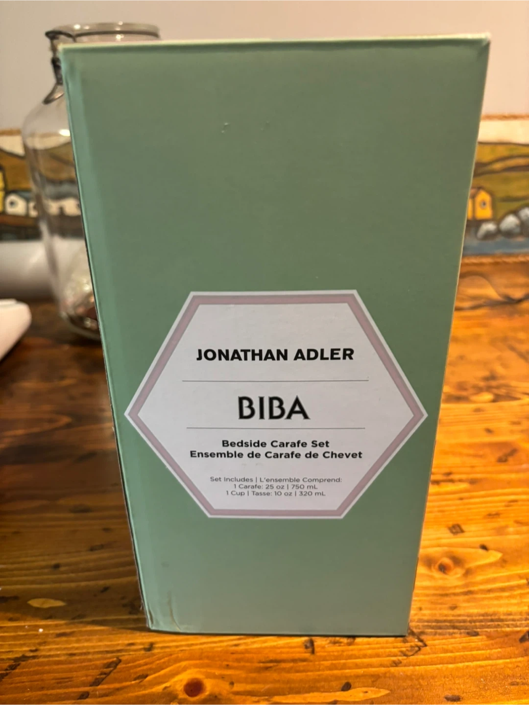 Jonathan Adler BIBA Bedside Carafe Set. Set includes 1 Carafe (25 oz / 750 mL) and 1 Cup (10 oz / 300 mL). Fragile handle with care. Dishwasher safe.