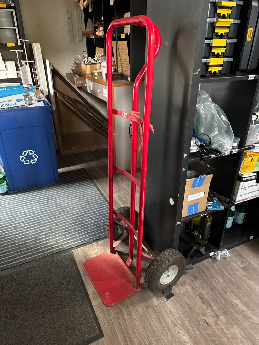 This is a red hand truck dolly, built for moving heavy items. It's constructed with sturdy metal for durability. It has two large wheels for easy transport over various surfaces. tires need inflating