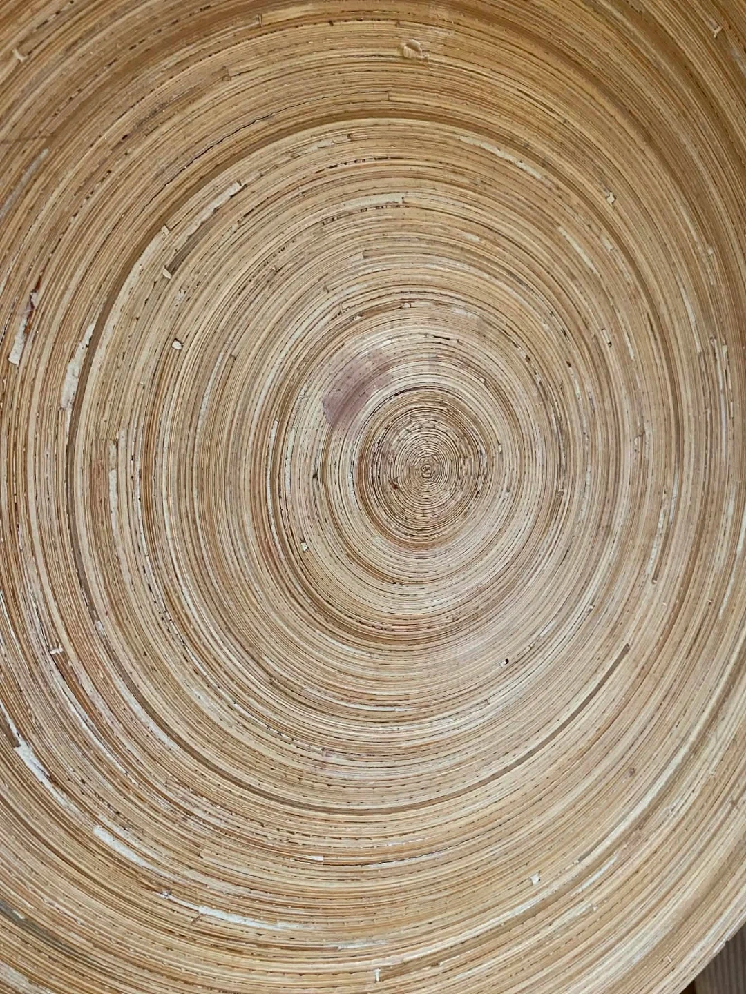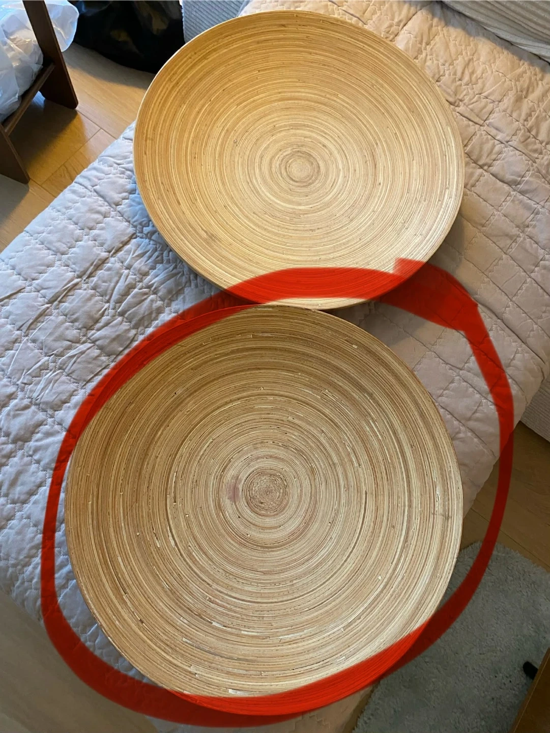 ONE large bamboo bowl - circled in red (the other is already sold). It has a natural wood grain finish. There's a slight marking in the center, as shown in photo, but other than that, it's like new. Used lightly during holiday seasons only and packed away for most of the rest. Great for entertaining or as a decorative piece.
