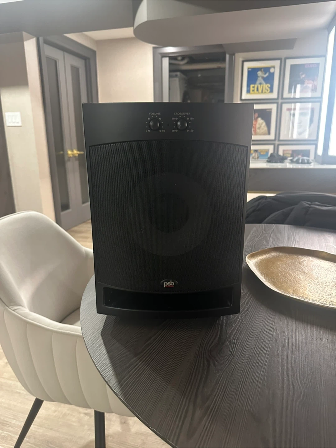 This is a PSB Speakers Alpha SubSeries 1 powered subwoofer. It has a black finish and a front-firing port. Connections include LFE input, RCA line level inputs, and speaker level inputs. It's great for enhancing your home theatre sound system!
