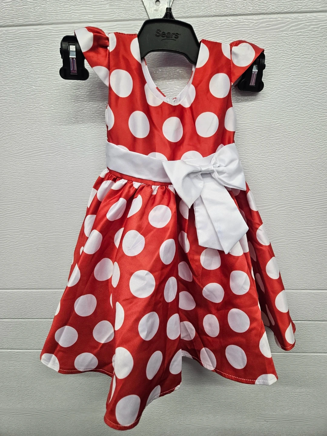 Cute red and white polka dot dress with a white sash and bow. Made with 35% cotton and 65% polyester. Great for special occasions or everyday fun!