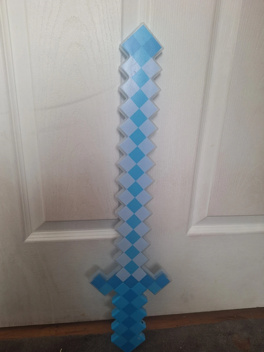It's a toy sword resembling the Diamond Sword from Minecraft. The toy is blue and white with a diamond pattern. It's made of plastic.