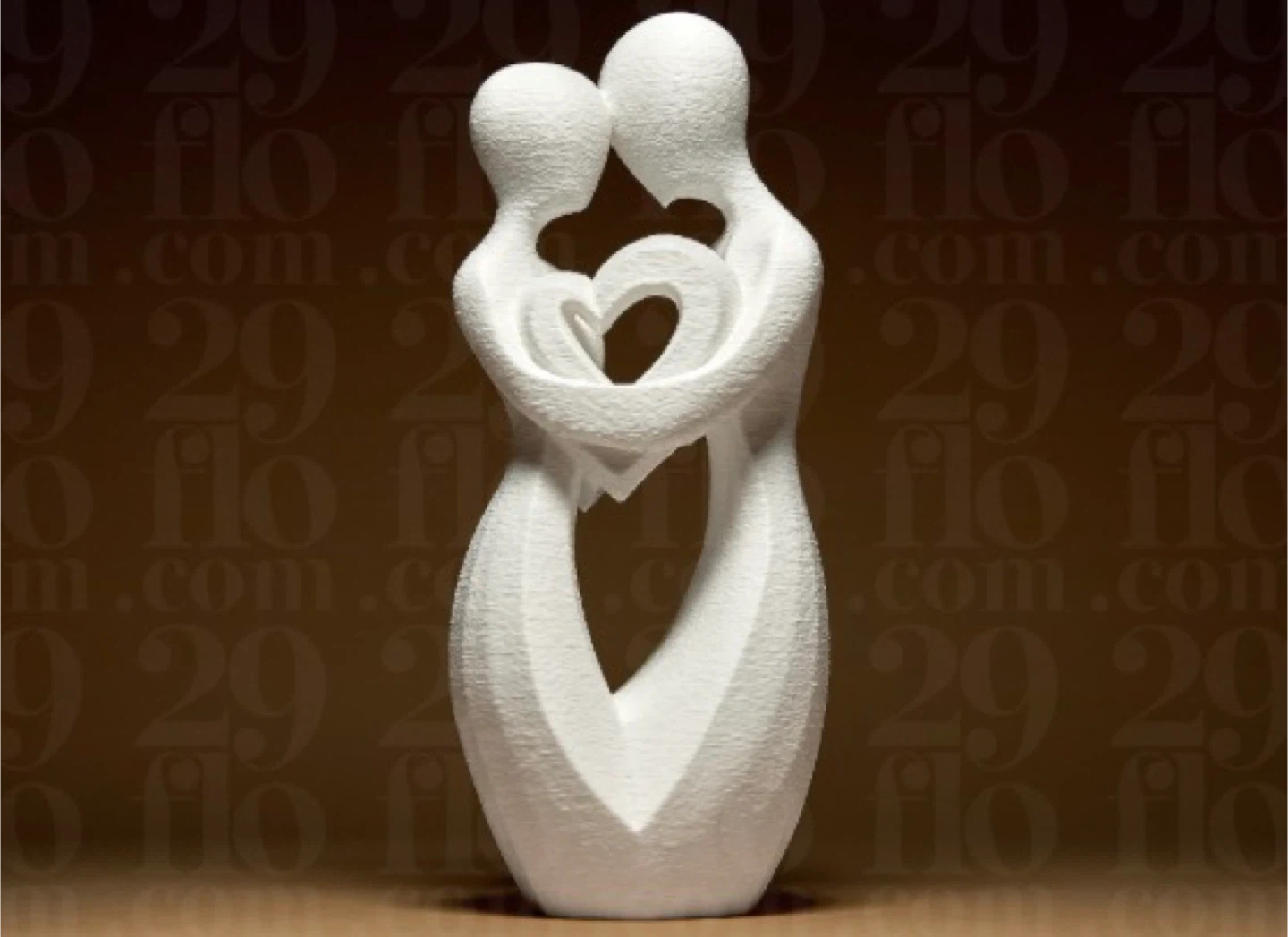 A modern abstract sculpture depicting a couple embracing and holding a heart. It's made of a white, textured material. This piece would make a lovely decorative accent for any home. Can customize colours