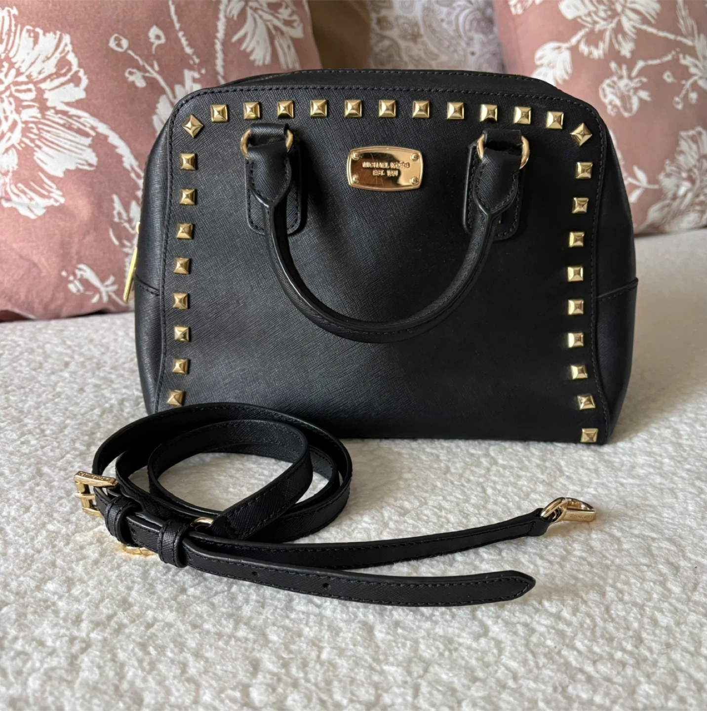 This is a Michael Kors satchel handbag in black. It features gold-tone stud detailing and comes with a detachable shoulder strap. Inside, it has a zippered pocket and slip pockets.