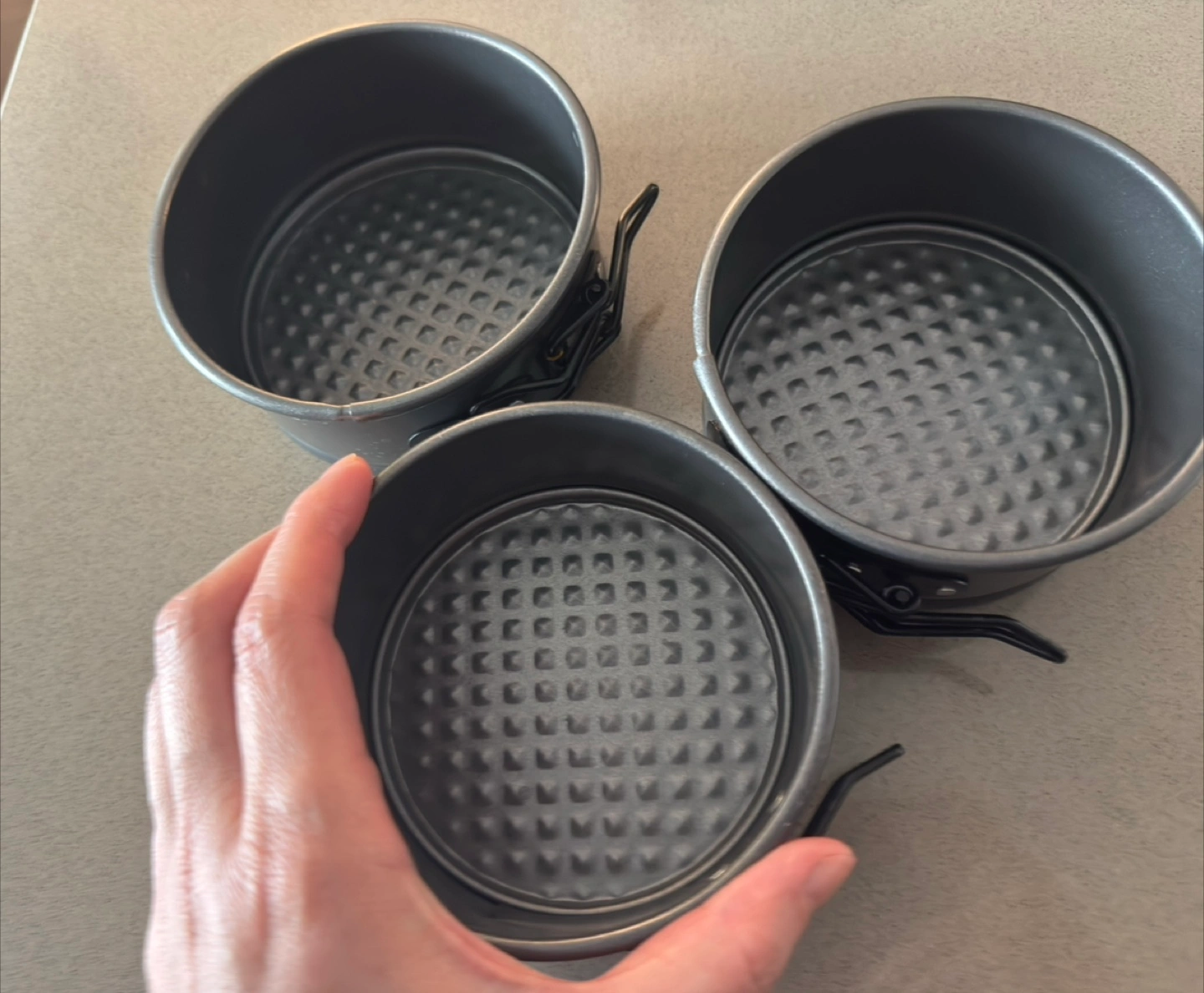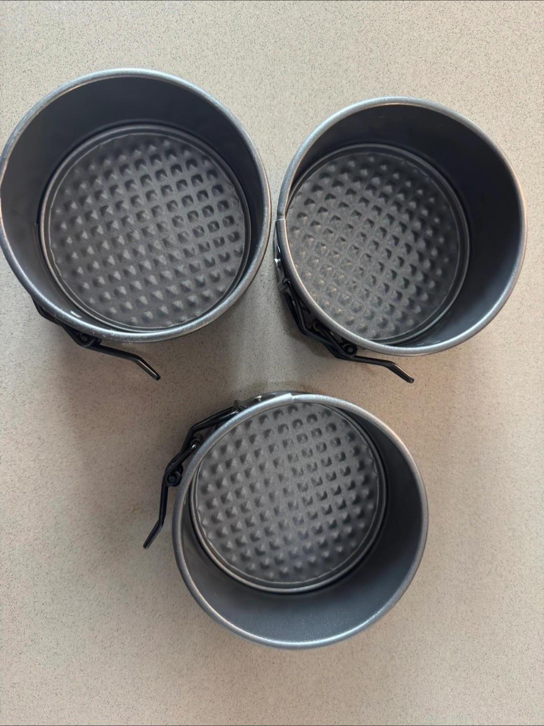 Three round springform cake pans for baking. They feature a non-stick diamond pattern base and a detachable side for easy release. Great for cheesecakes and other desserts!