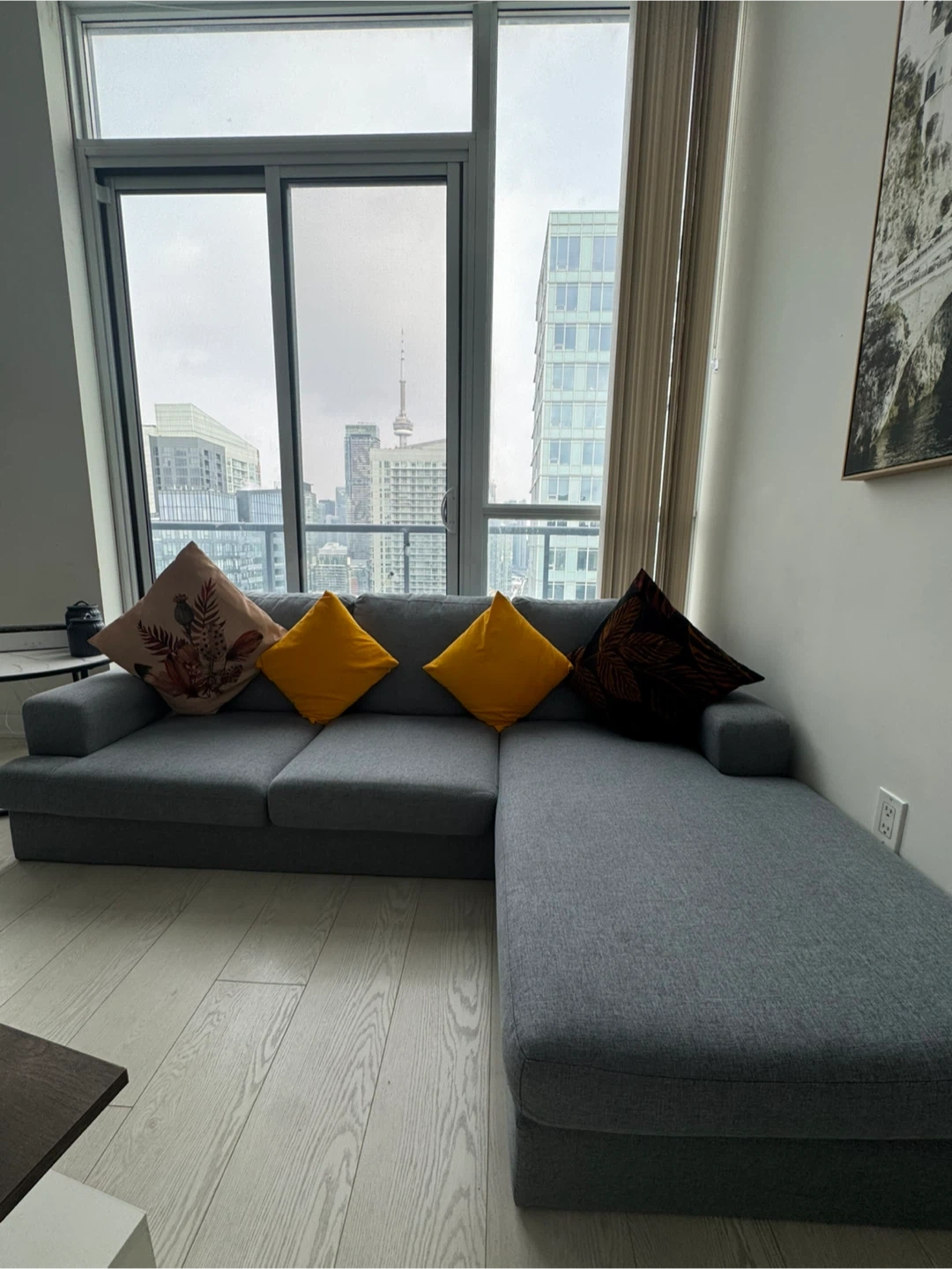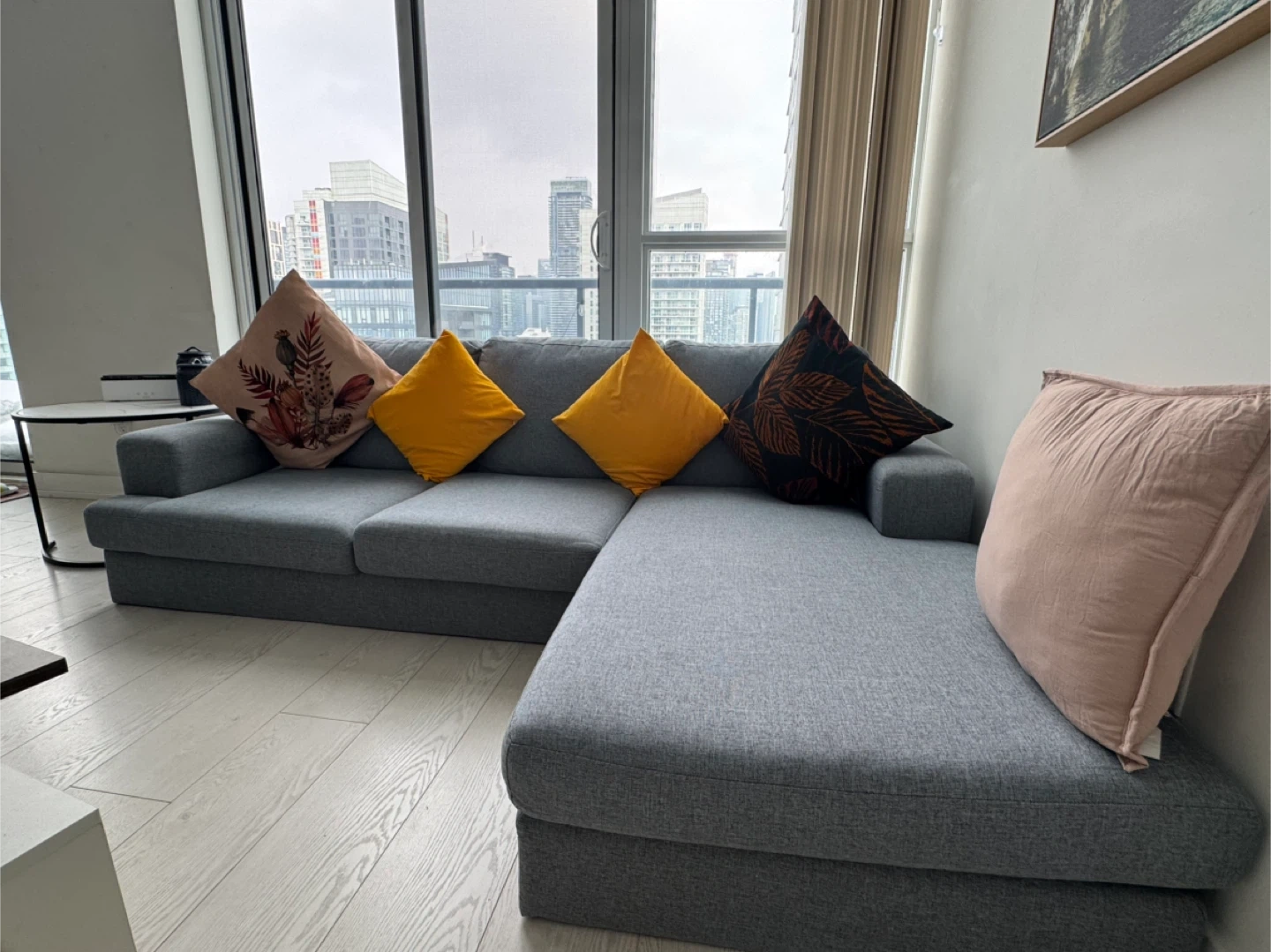 Comfortable and stylish L-shaped sectional sofa in a modern grey fabric. Features a spacious chaise lounge, perfect for relaxing, lounging, or hosting guests. The neutral color works beautifully with any décor and brightens up the living space.
