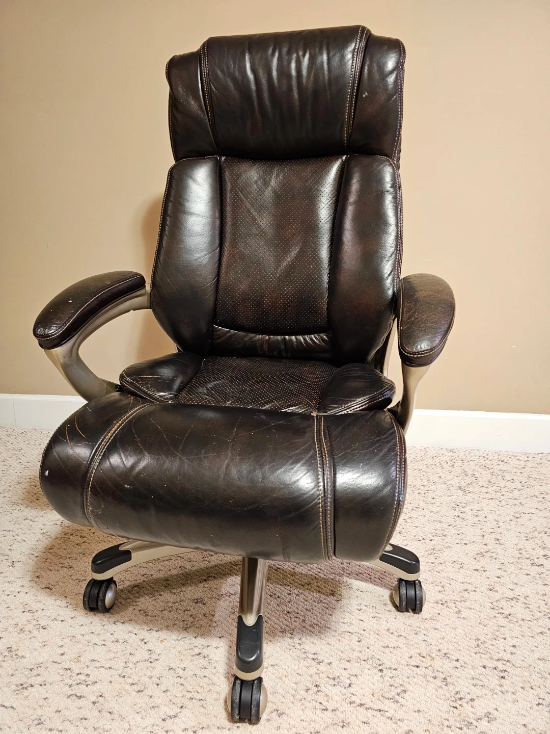 This office chair is upholstered in dark brown leather with contrasting stitching. It features a padded seat and backrest for comfort. The chair has a five-star base with wheels for easy mobility. Brought from Costco 3 years ago. It is in good condition with normal usage signs.