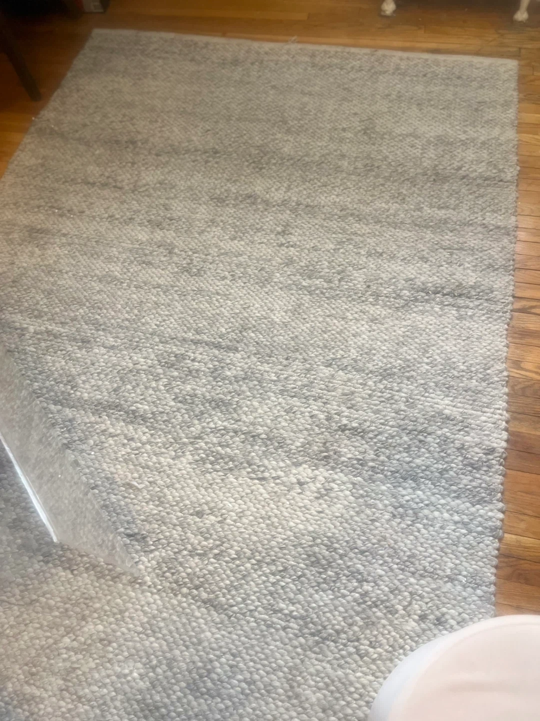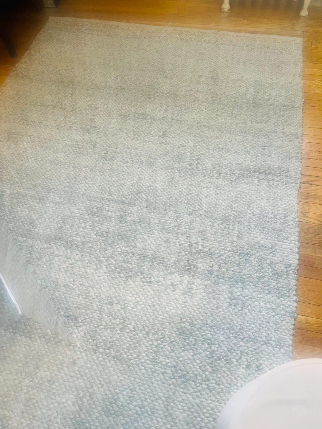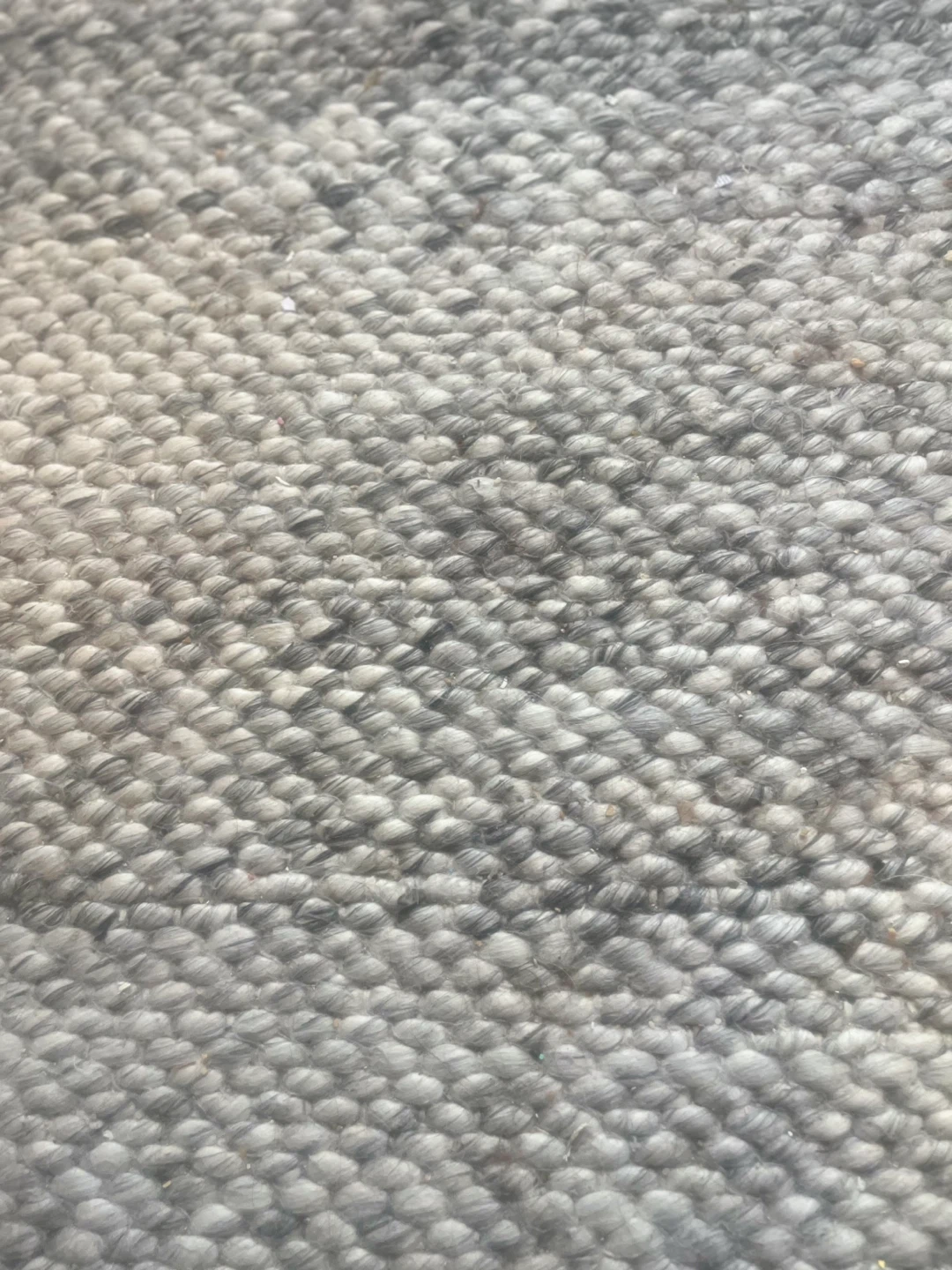 A soft, light grey area rug with a textured weave. It's a neutral colour that'll go with most decor. Provides a cozy feel underfoot. Soft & light tones.