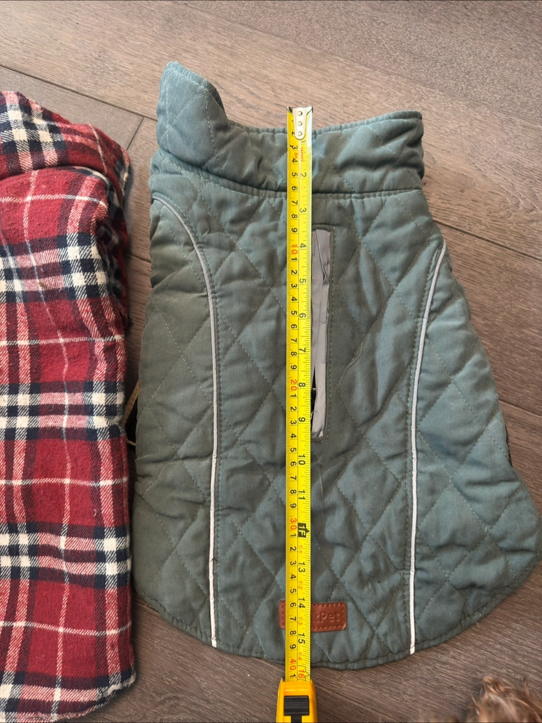 Two dog coats included: one cozy plaid and one quilted green winter jacket with a zippered pocket. The green jacket measures approximately 16 inches in length. Both are great for keeping your furry friend warm during colder weather!