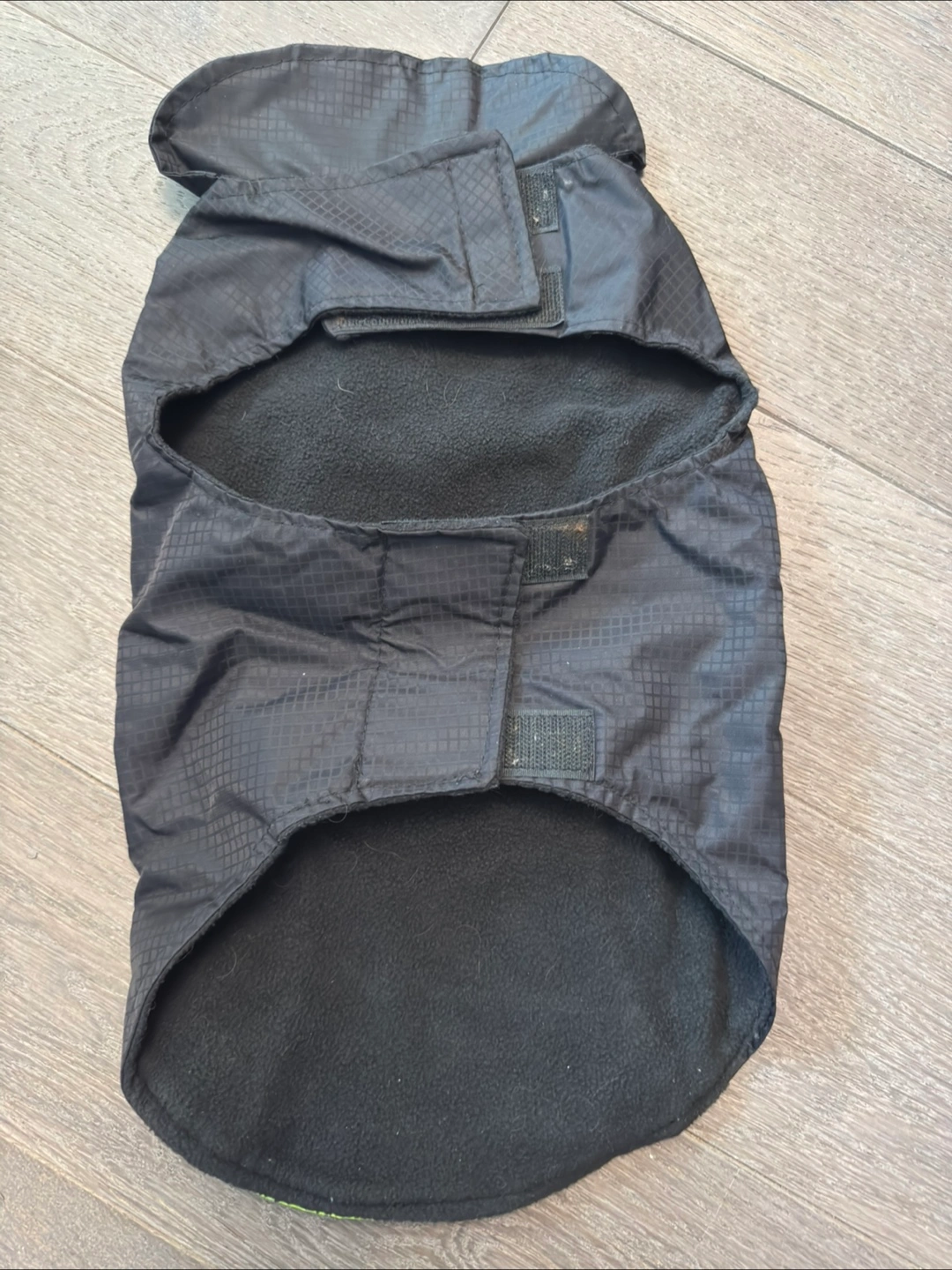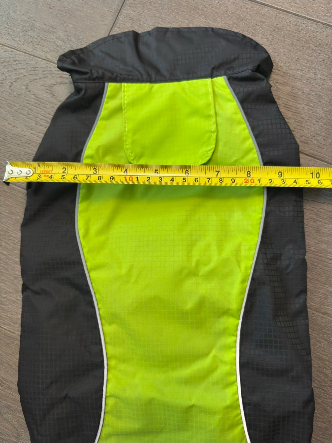 This is a warm winter coat for dogs. It's black and neon green with reflective piping. Measures approximately 17 inches in length. Adjustable velcro closures for a snug fit. Perfect for keeping your furry friend cozy on chilly walks!