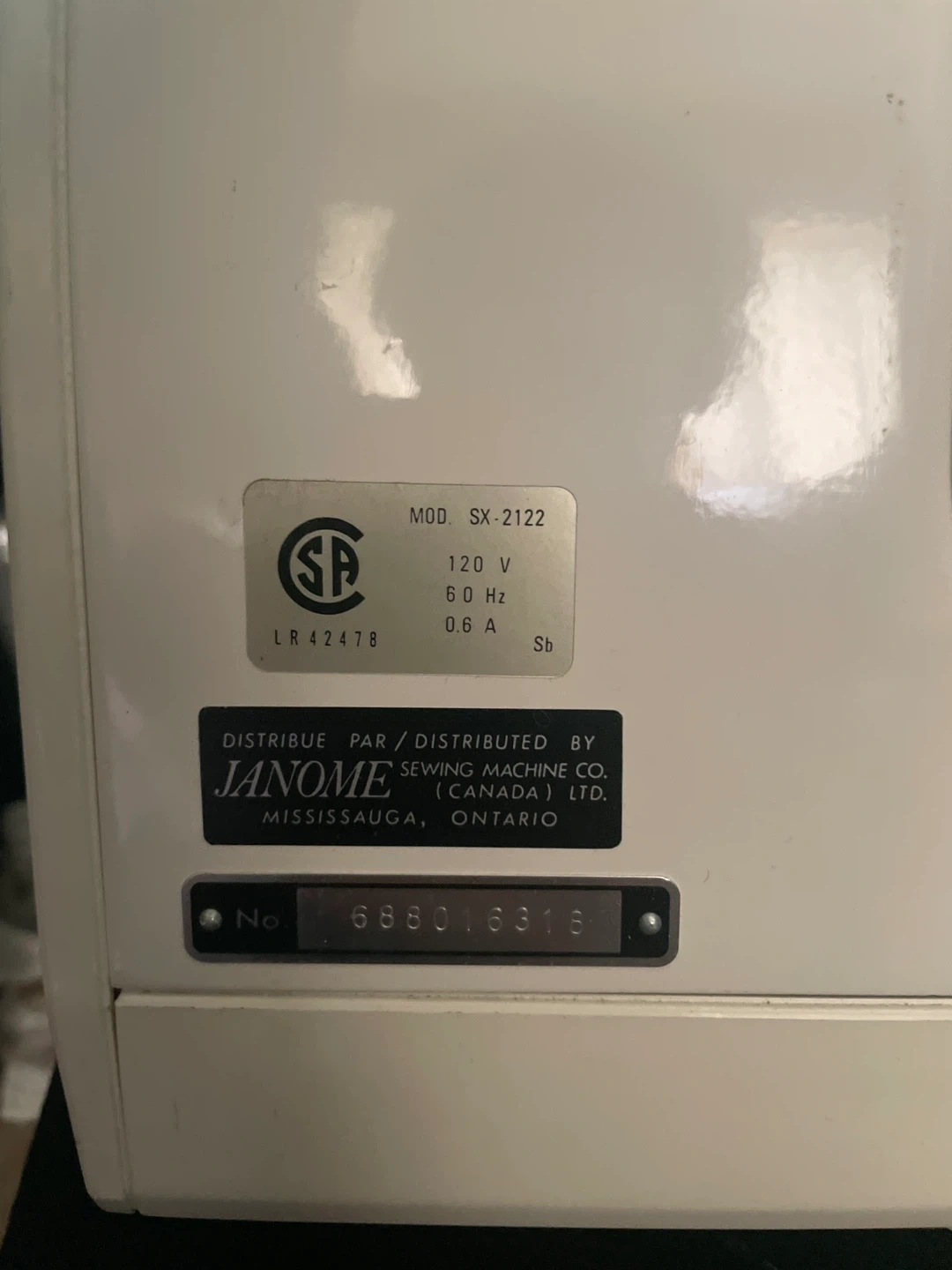 This is a Janome Computer SX-2122 sewing machine. It's a cream-coloured unit with various stitch settings. The power cord is included.