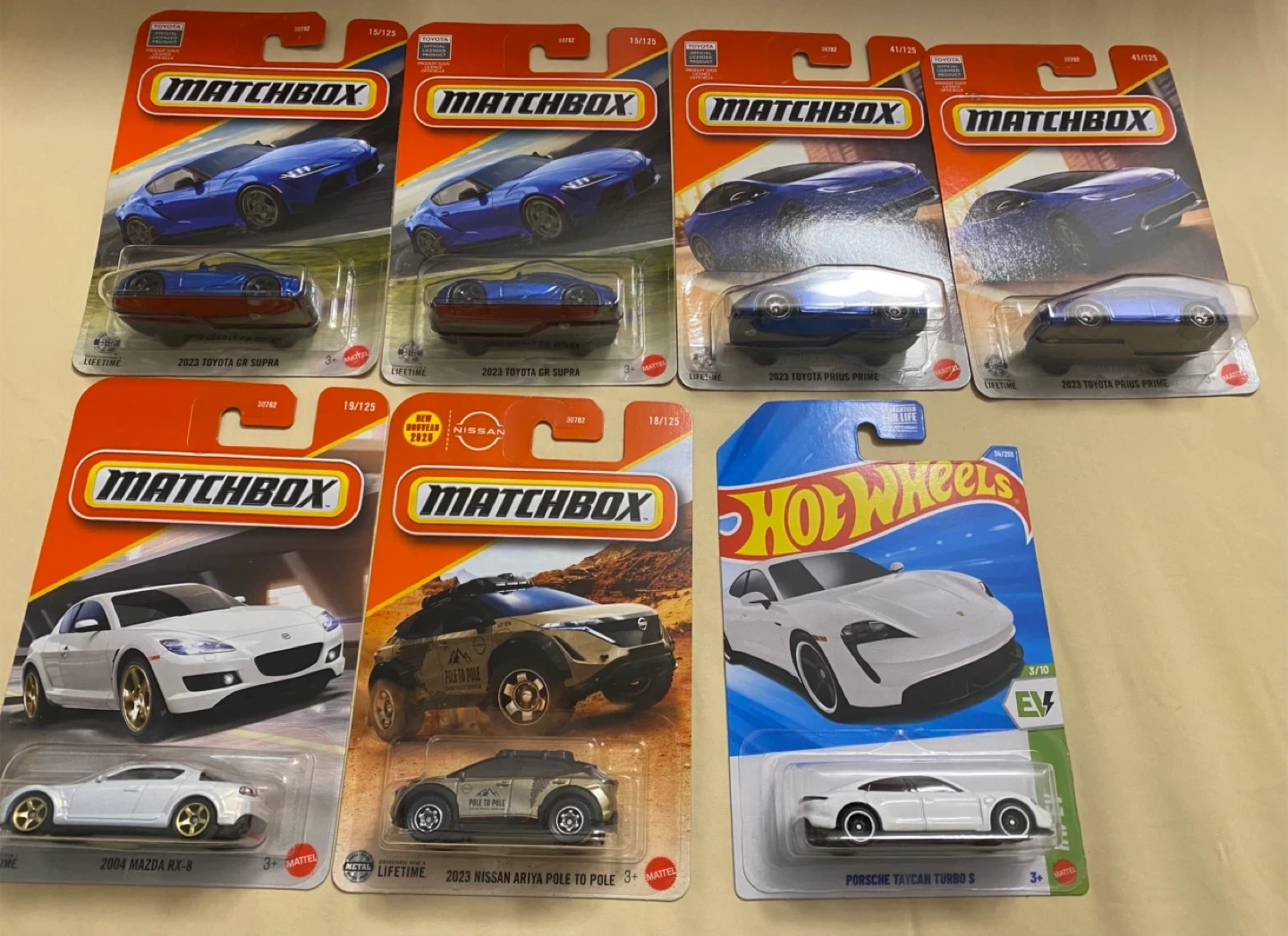 Collection of die-cast model cars including Matchbox and Hot Wheels brands. Models featured are 2023 Toyota GR Supra, 2023 Toyota Prius Prime, 2004 Mazda RX-8, 2023 Nissan Ariya Pole to Pole, and Porsche Taycan Turbo S. These are sealed in their original packaging.