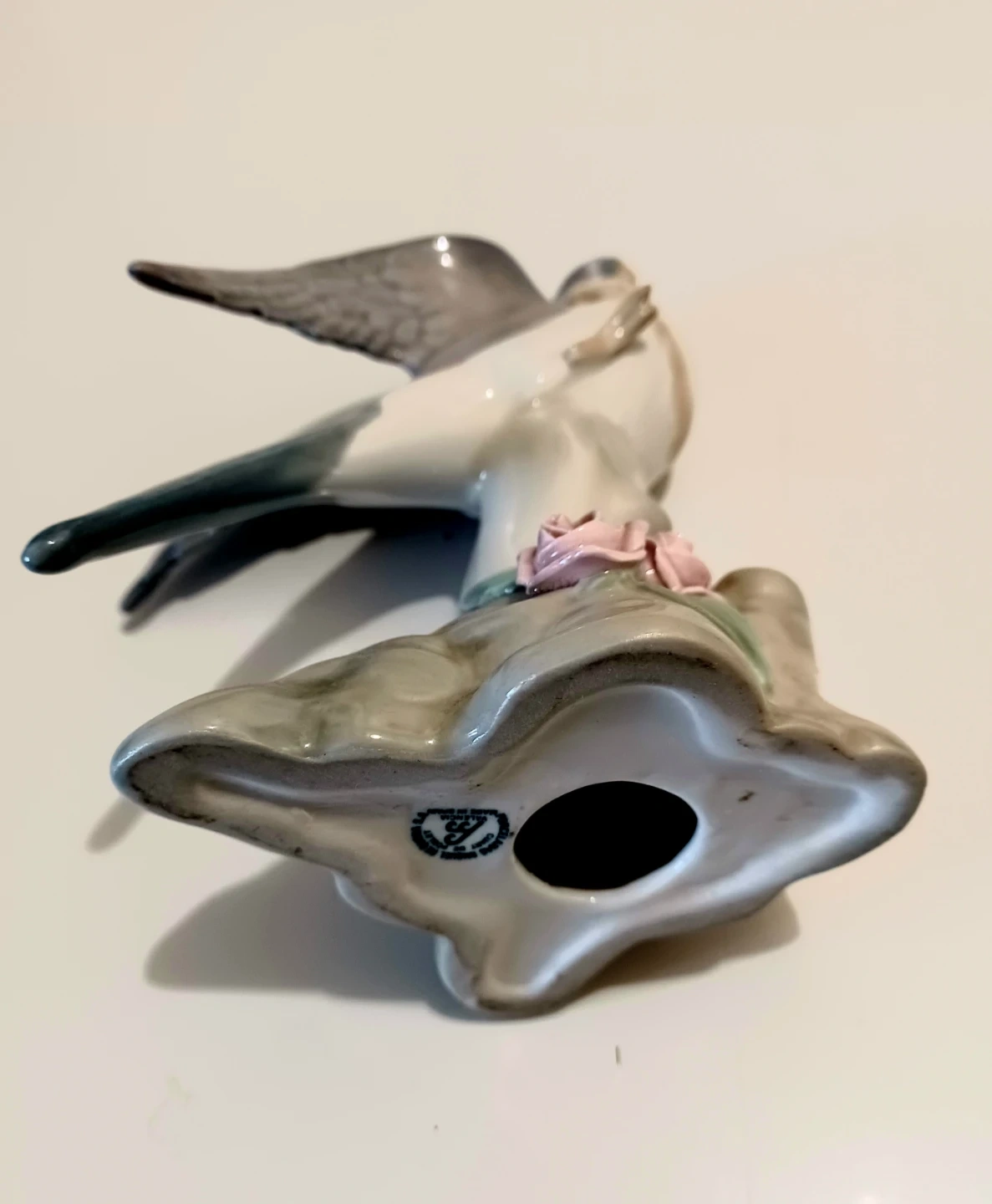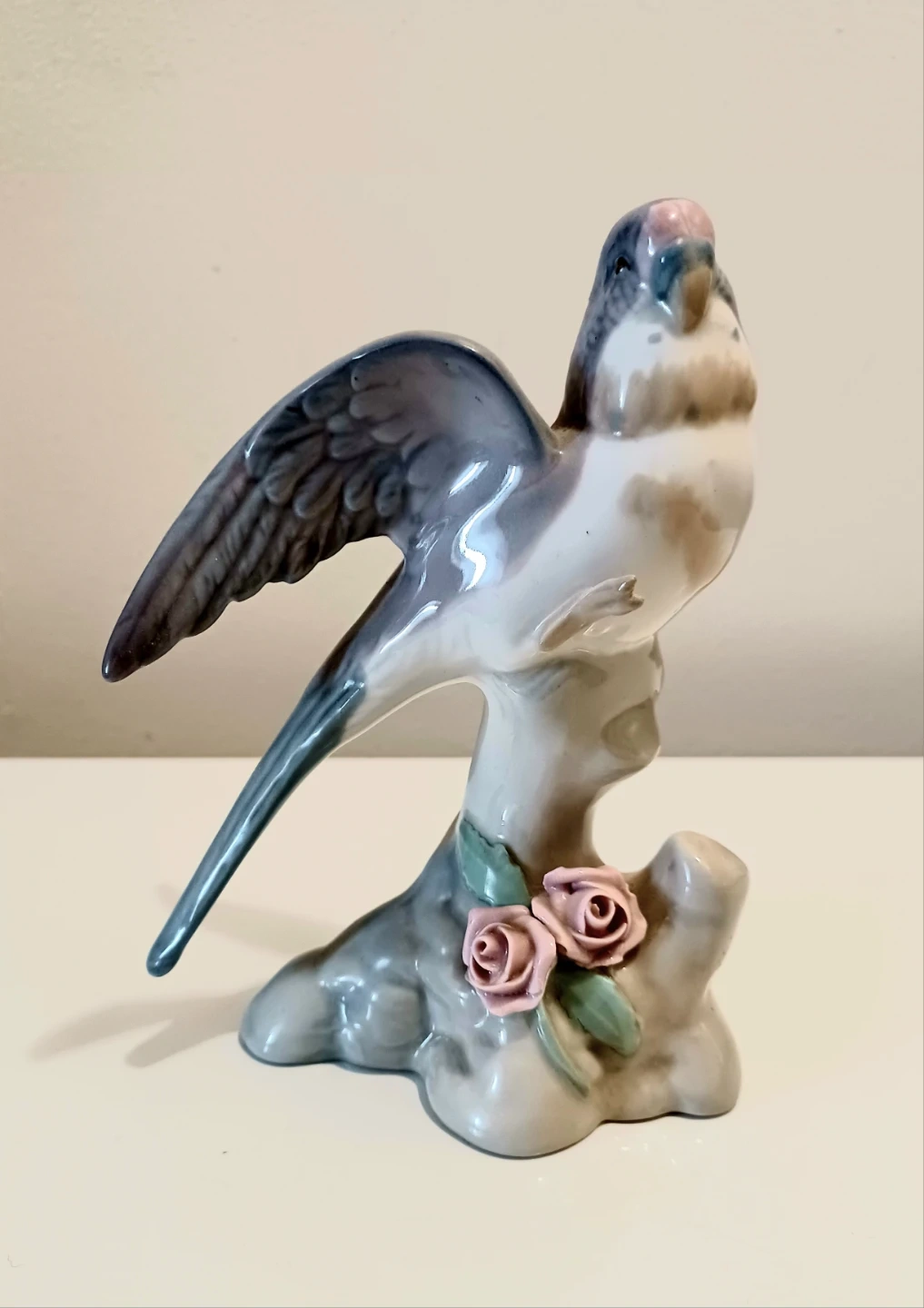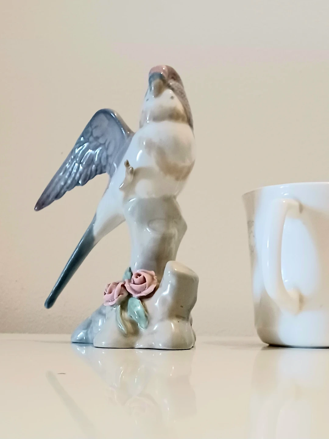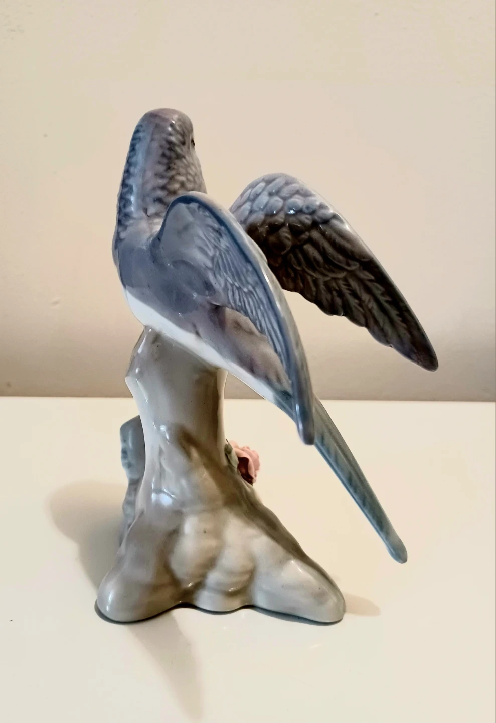 Miquel Requena Porcelanas Parakeet Figurine, crafted in Valencia, Spain, showcasing a beautiful grey and white plumage with delicate pink floral accents on its base. This piece brings a touch of Elegant Spanish artistry to any collection.