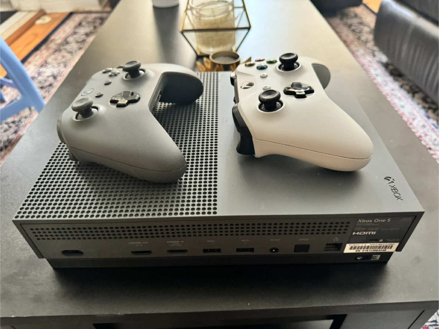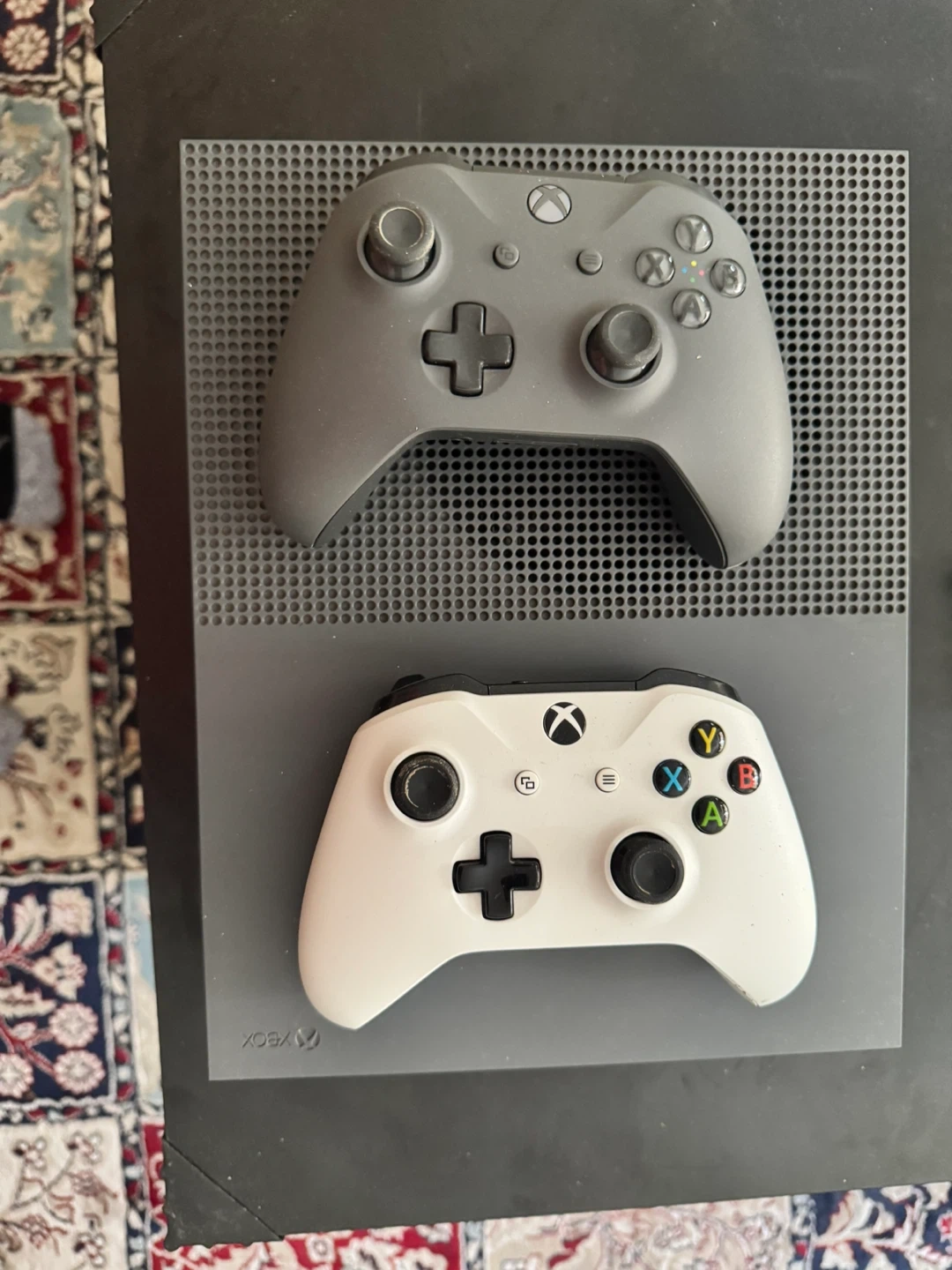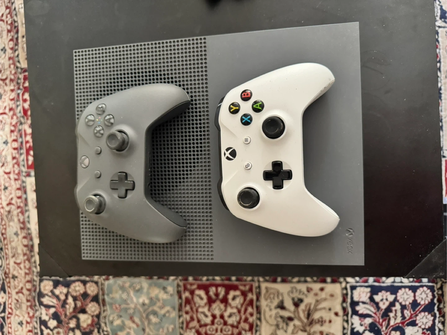 Includes an Xbox One S console, a grey controller, and a white controller. Perfect for playing multiplayer games with friends or family. All items are in good condition and ready for gaming!