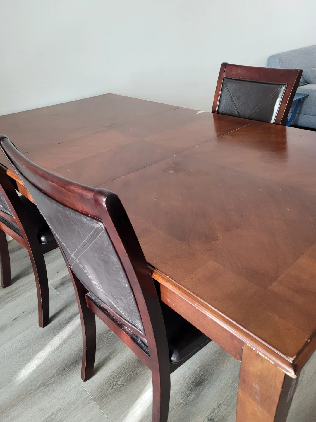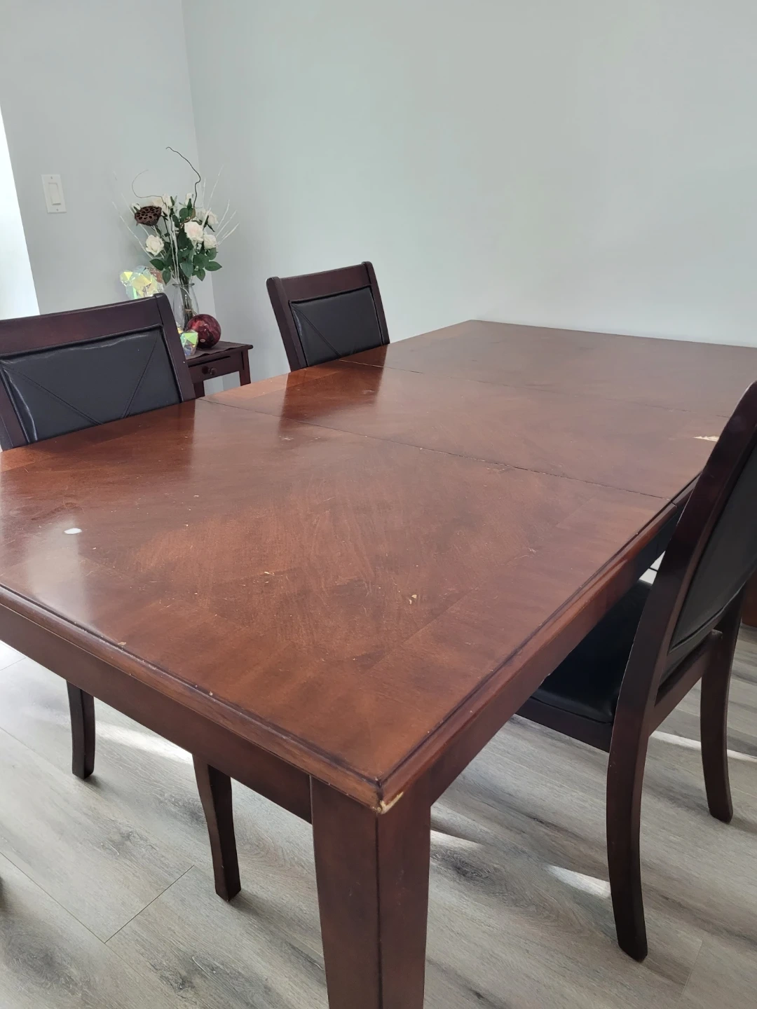 This is a lovely wooden dining table with 3 matching chairs. 1 chair is broken. The table has some scratches. But it is not big issue at all.It's a great set for family dinners or entertaining guests! It can 4 person table or 6 person table.