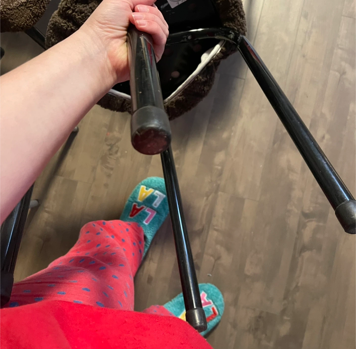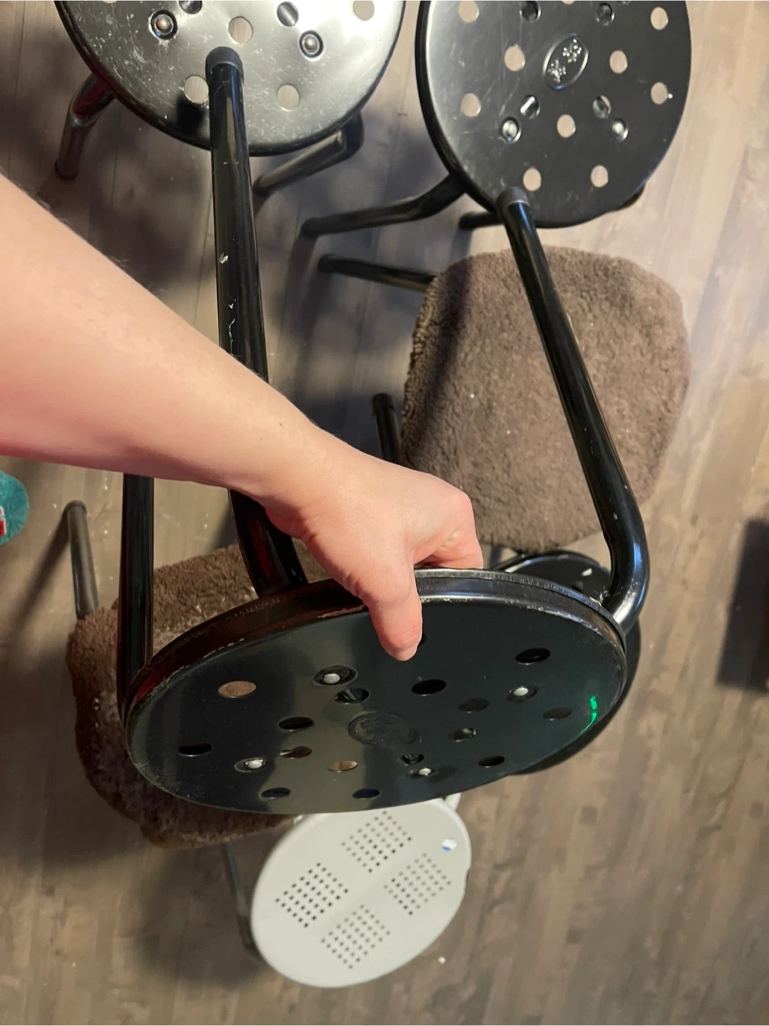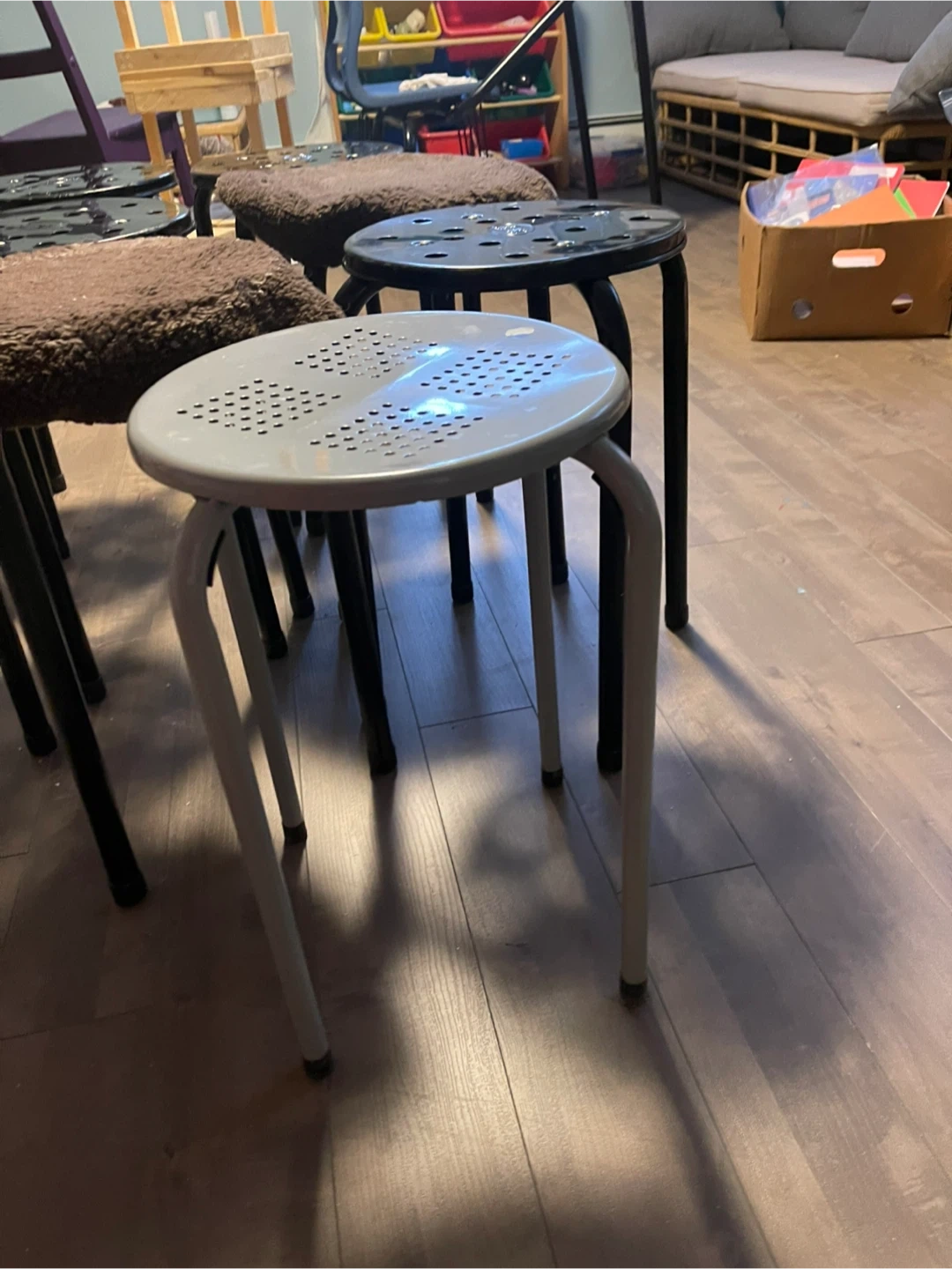 This set includes 7 metal stools. Four are black and one is light grey. They're sturdy and stackable for easy storage. Great for extra seating in a kitchen or workshop!