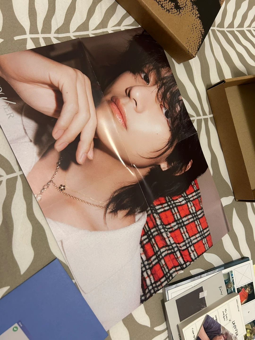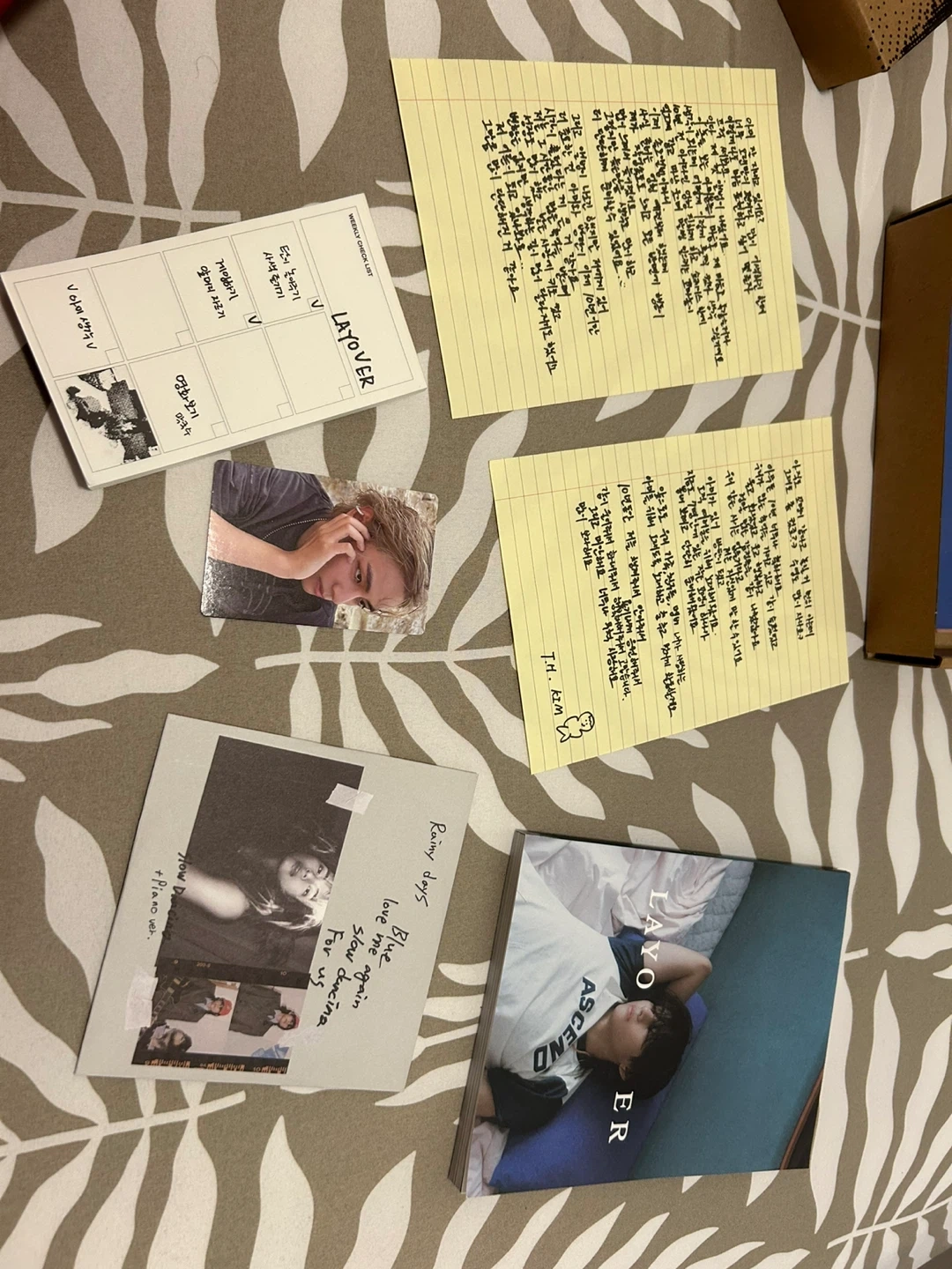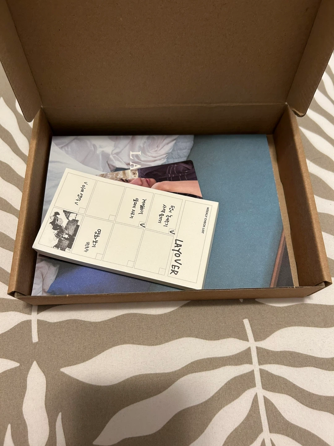 This is the BTS V Layover album box set, including the album, photobook, and various photo cards and stickers. It's a complete package for fans. Includes original packaging and all contents.