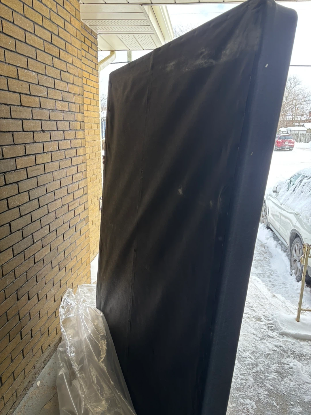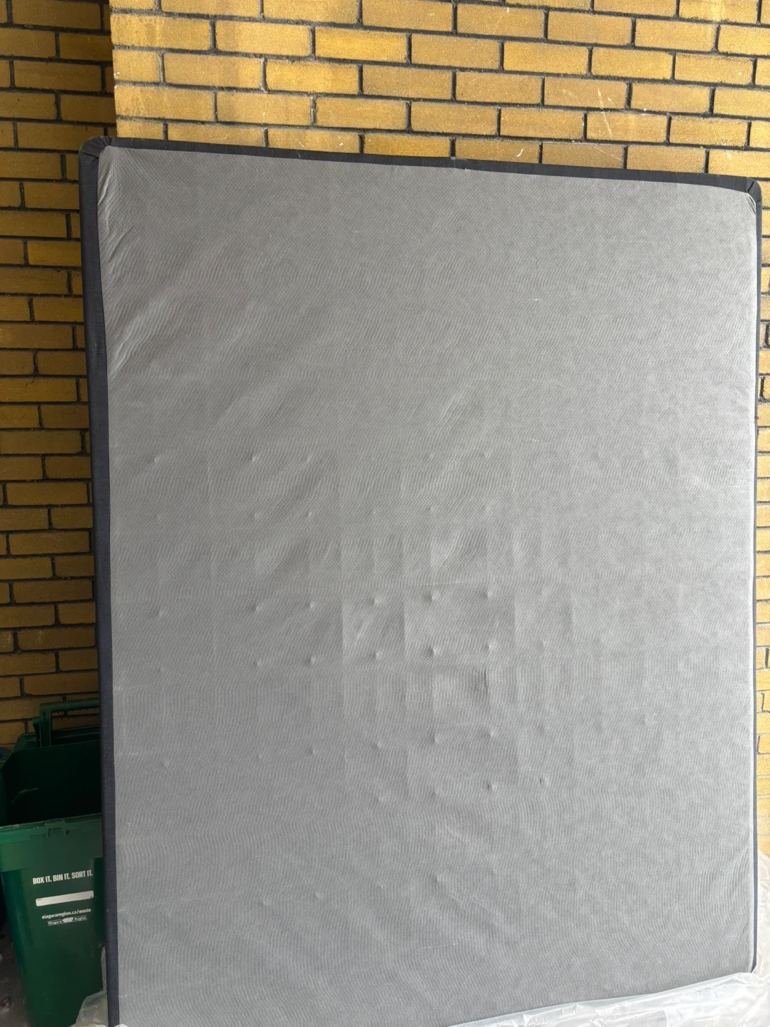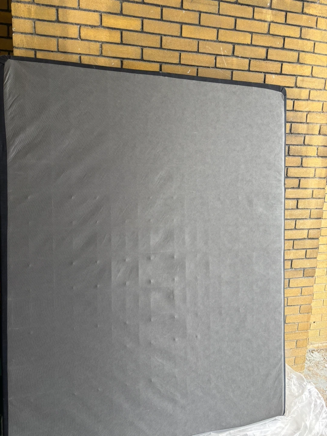 Queen size box spring in a grey fabric. It has a dark blue trim around the edges. This box spring is in good condition and provides a solid foundation for your mattress. Askin 120 OBO. Need it gone ASAP