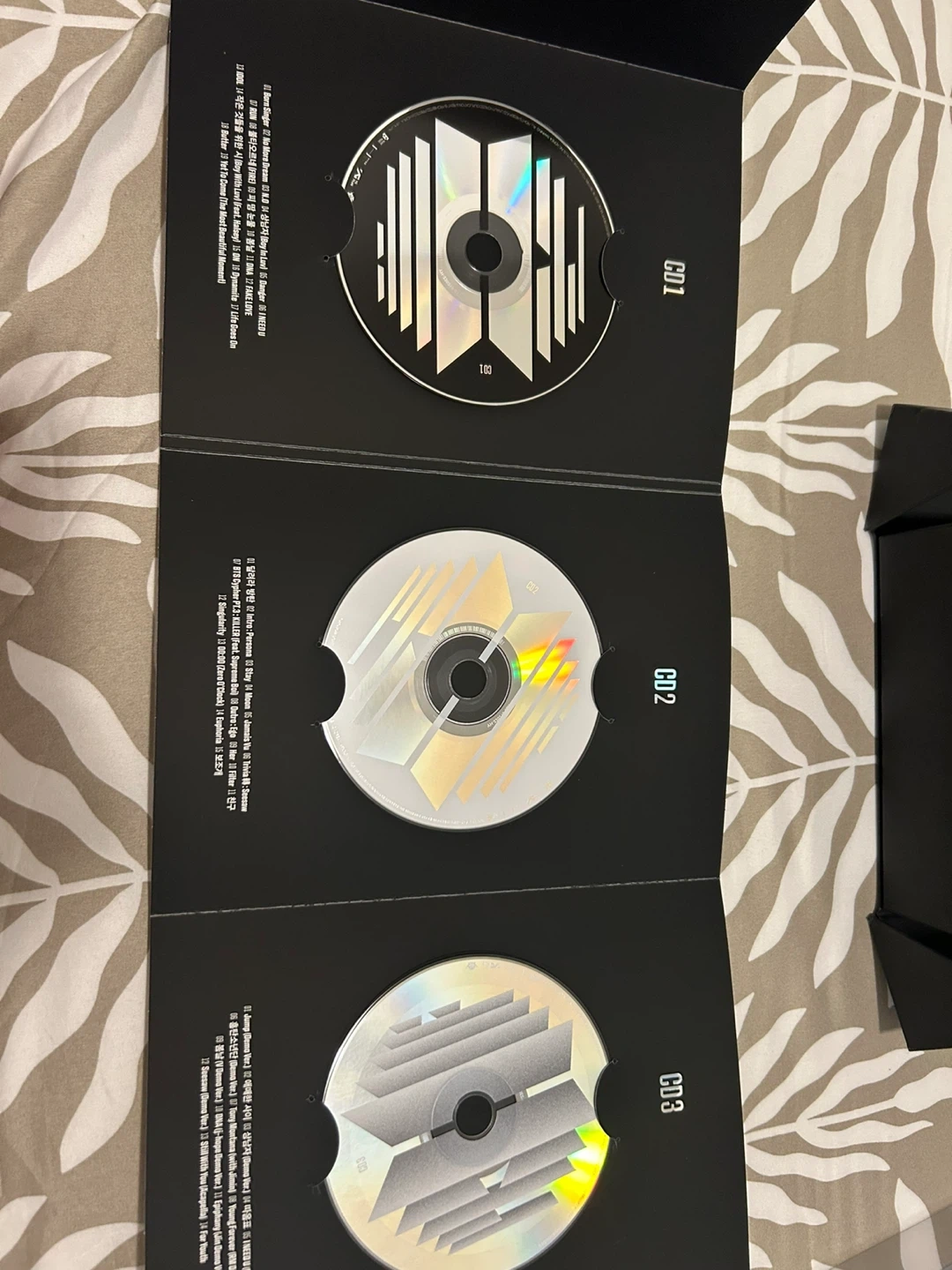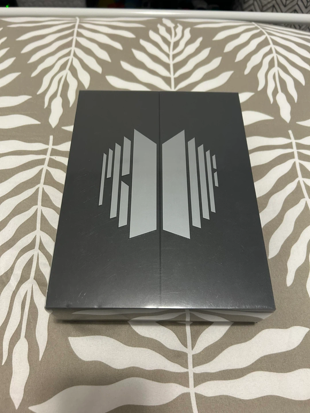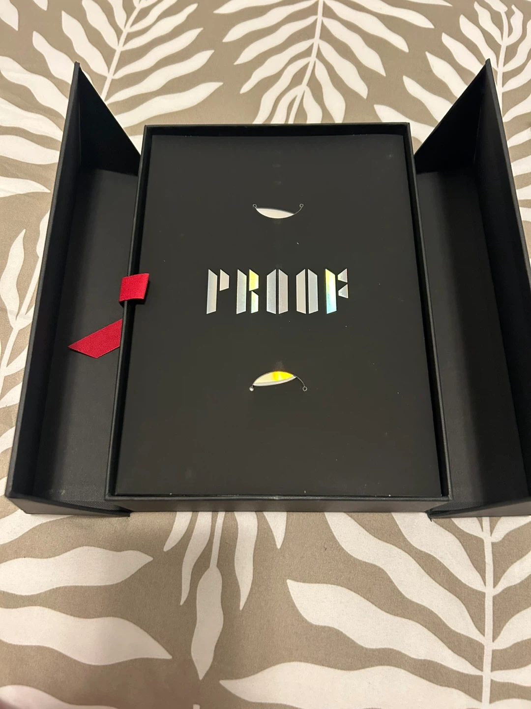 This is the BTS Proof album set. It includes three CDs, several photo cards, photo books and poster. The packaging is a dark grey box with the album title 'Proof' on the inside lid.