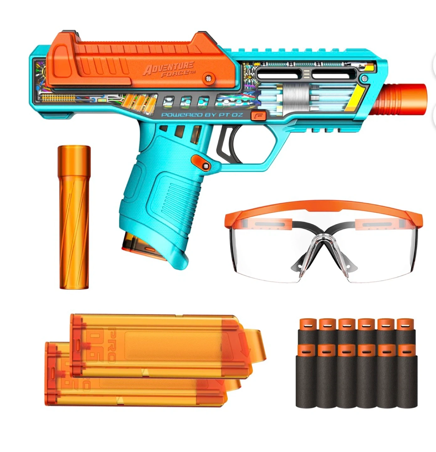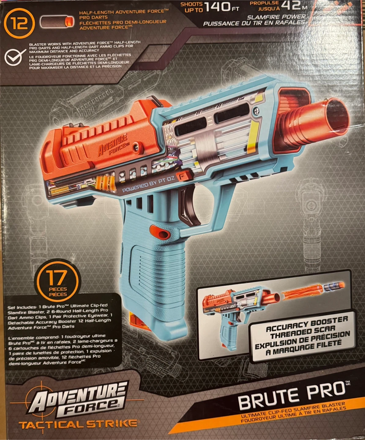 This is the Adventure Force Brute Pro Tactical Strike Ultimate Clip-fed Slamfire Blaster. It shoots up to 140 feet and has a half-length adventure force pro darts system.