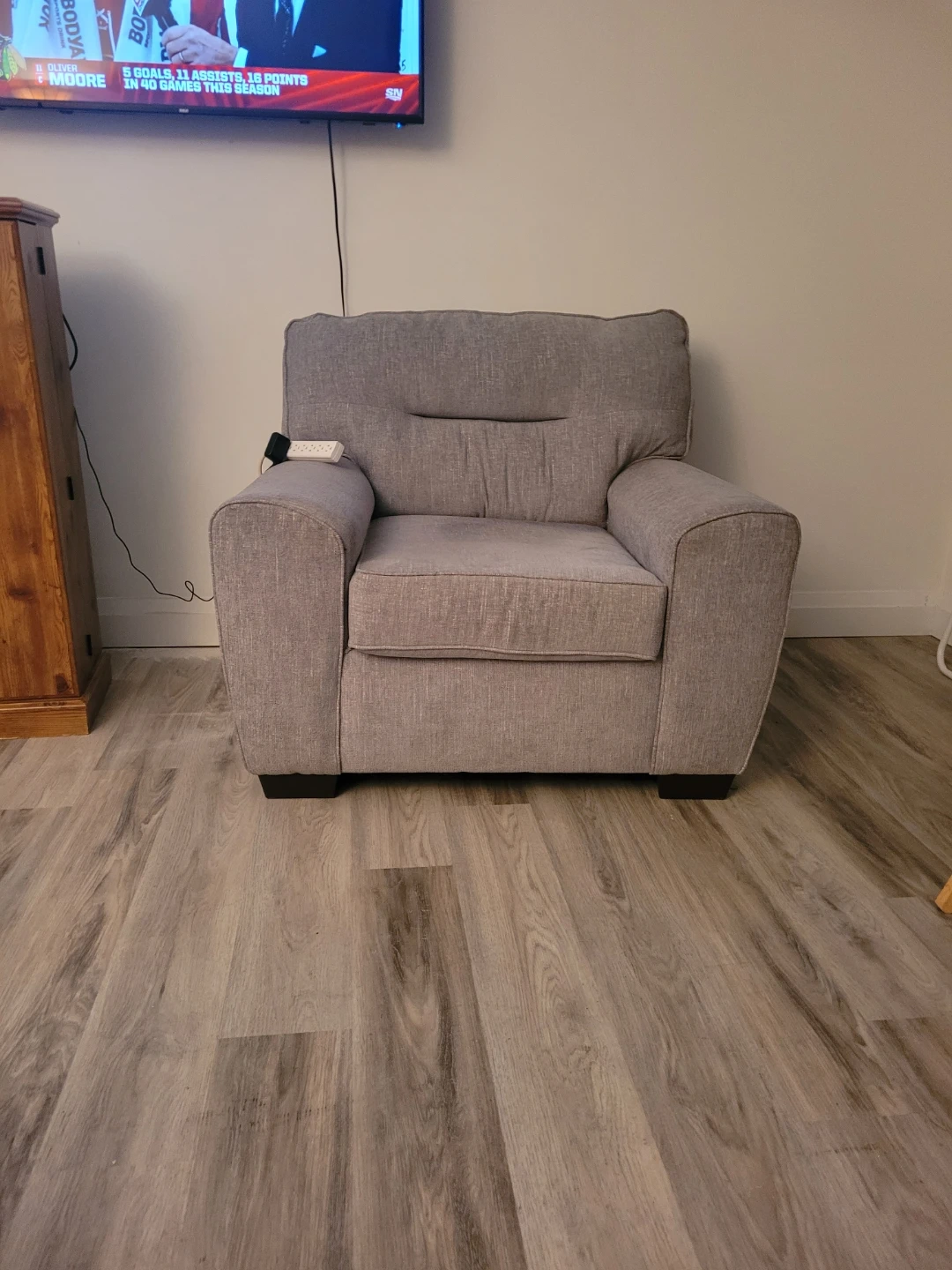 A matching grey fabric chair and three-seater sofa. Both pieces are upholstered in a durable, textured fabric. They're perfect for a living room or den, offering comfortable seating for multiple people.