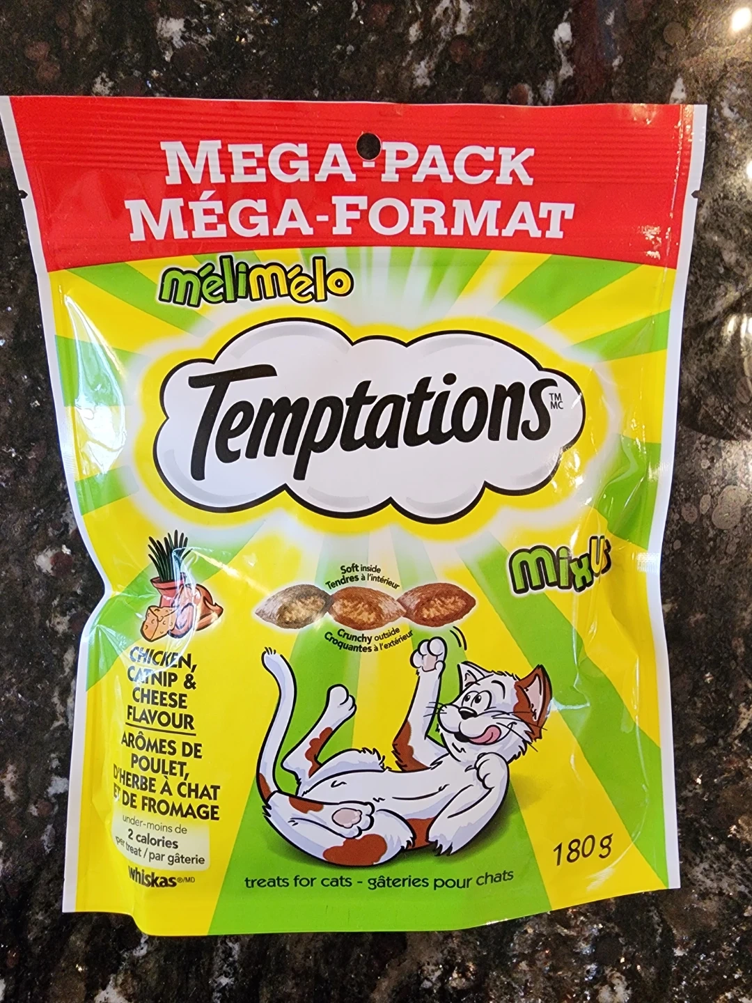 This Temptations mega pack features Temptations Mix Ups cat treats in Chicken, Catnip & Cheese flavour. Each treat has a soft inside and crunchy outside. Contains 180g.