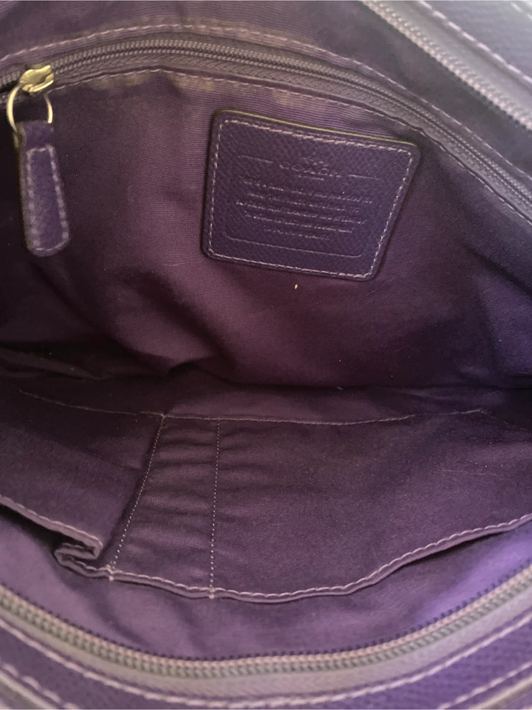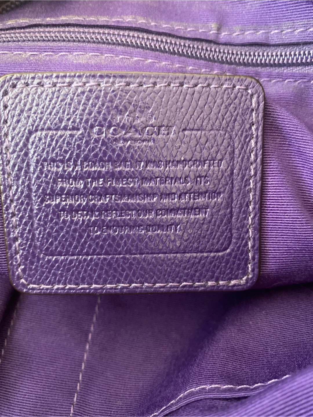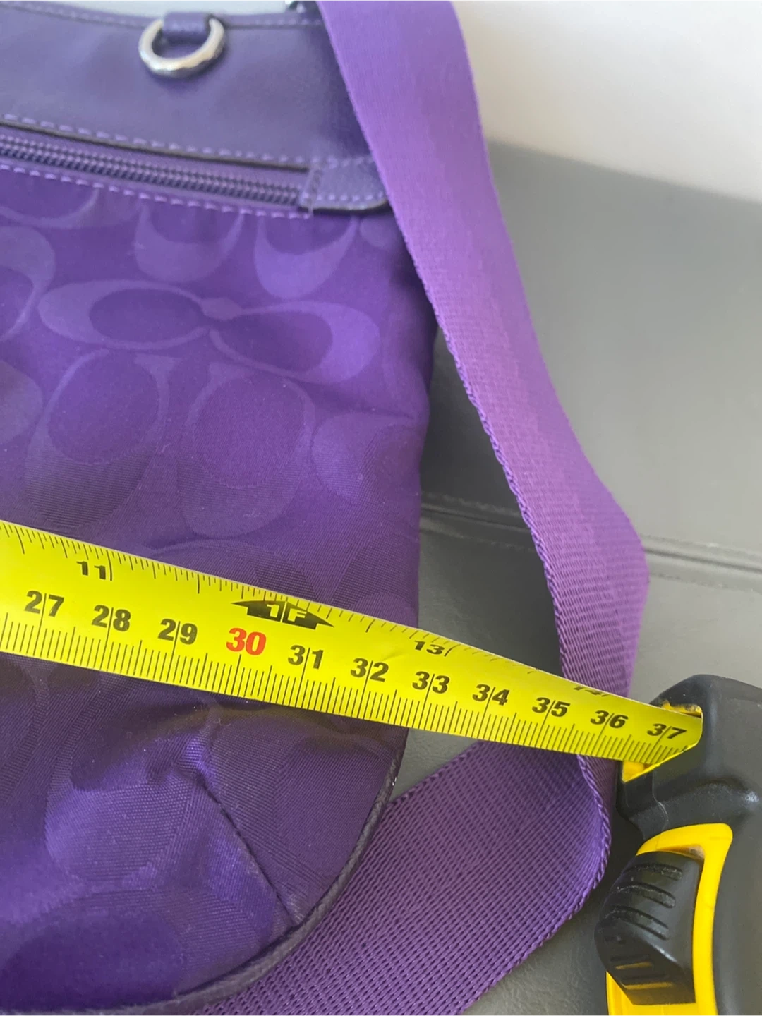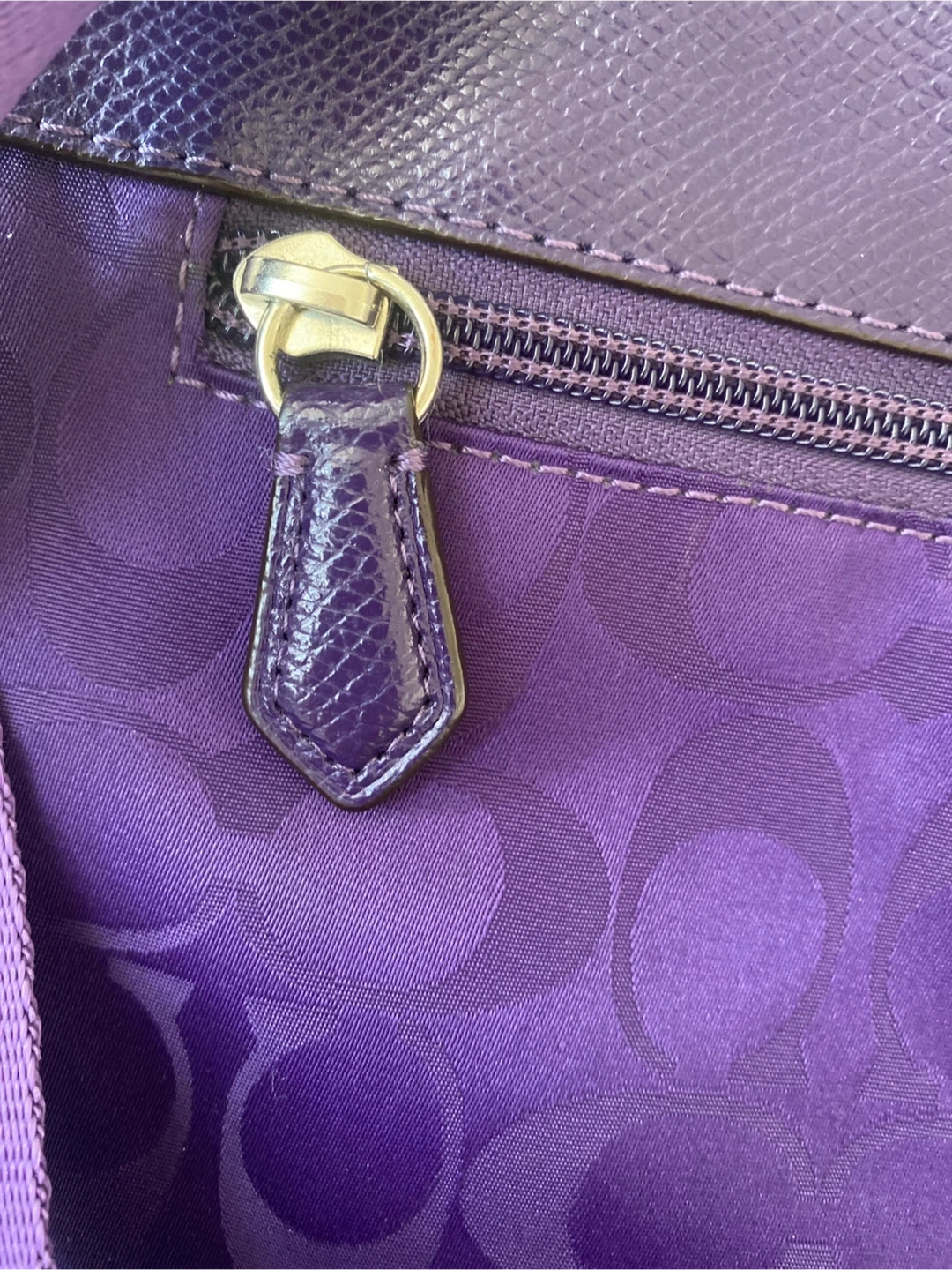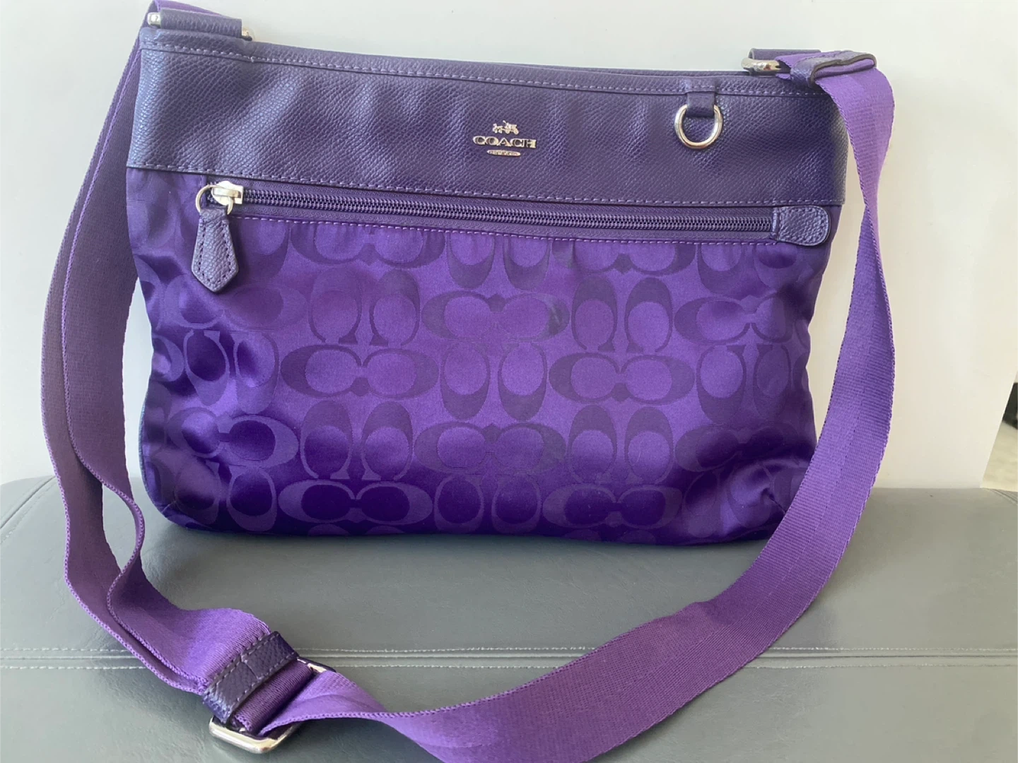 Coach crossbody bag in a vibrant purple with signature C jacquard pattern. It has a leather top panel and adjustable strap. Includes an exterior zippered pocket and interior compartments.