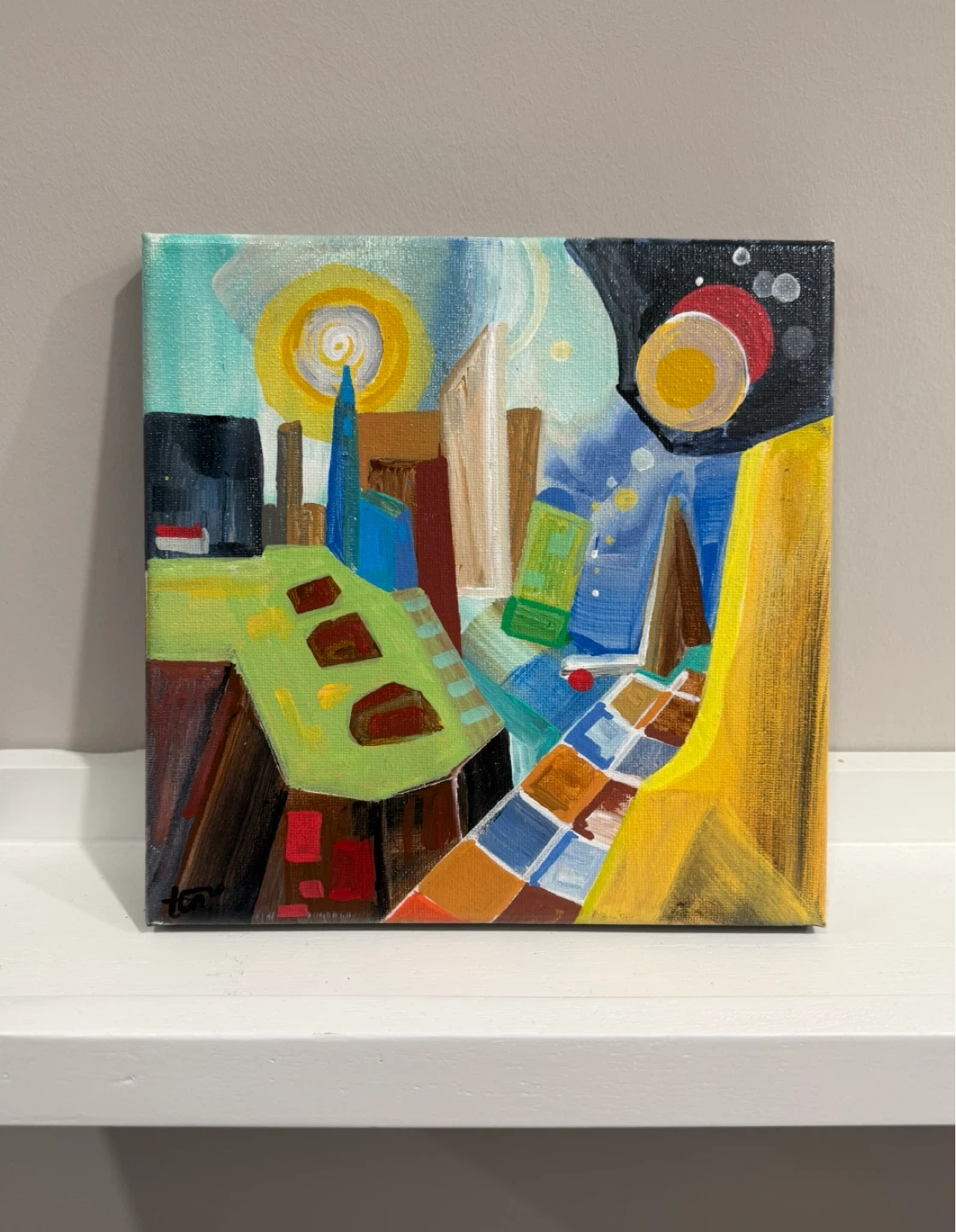 A colourful abstract cityscape acrylic painting on 8”X8”. This hand-painted unique piece would add a pop of colour to any room! Varnished with glossy topcoat making the colours more vibrant with a polished finish.