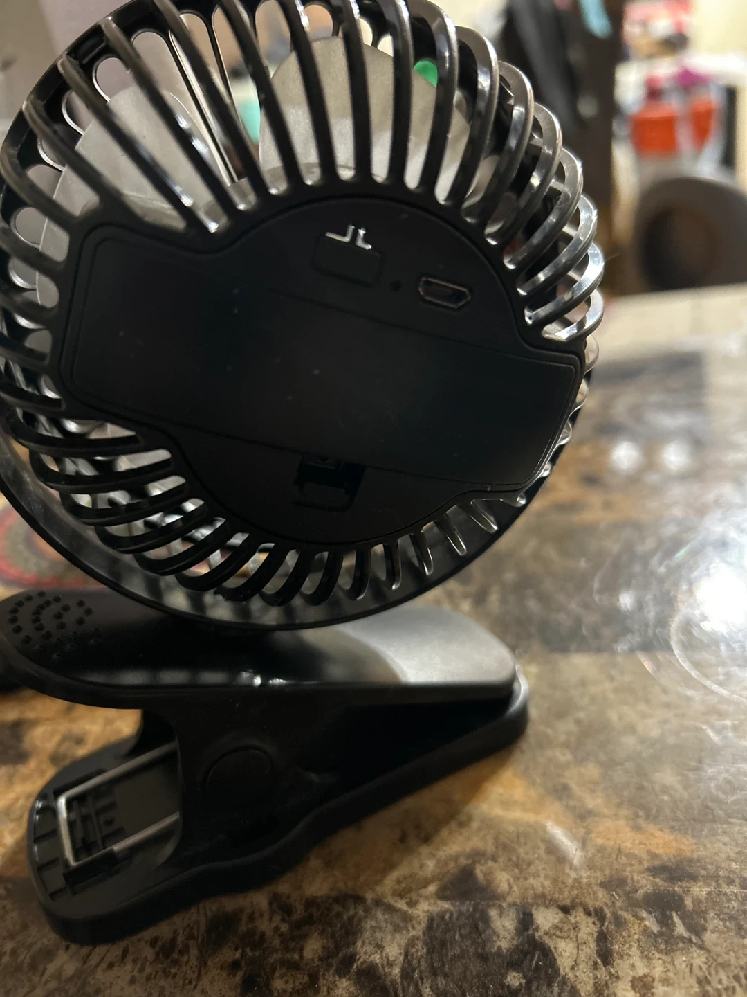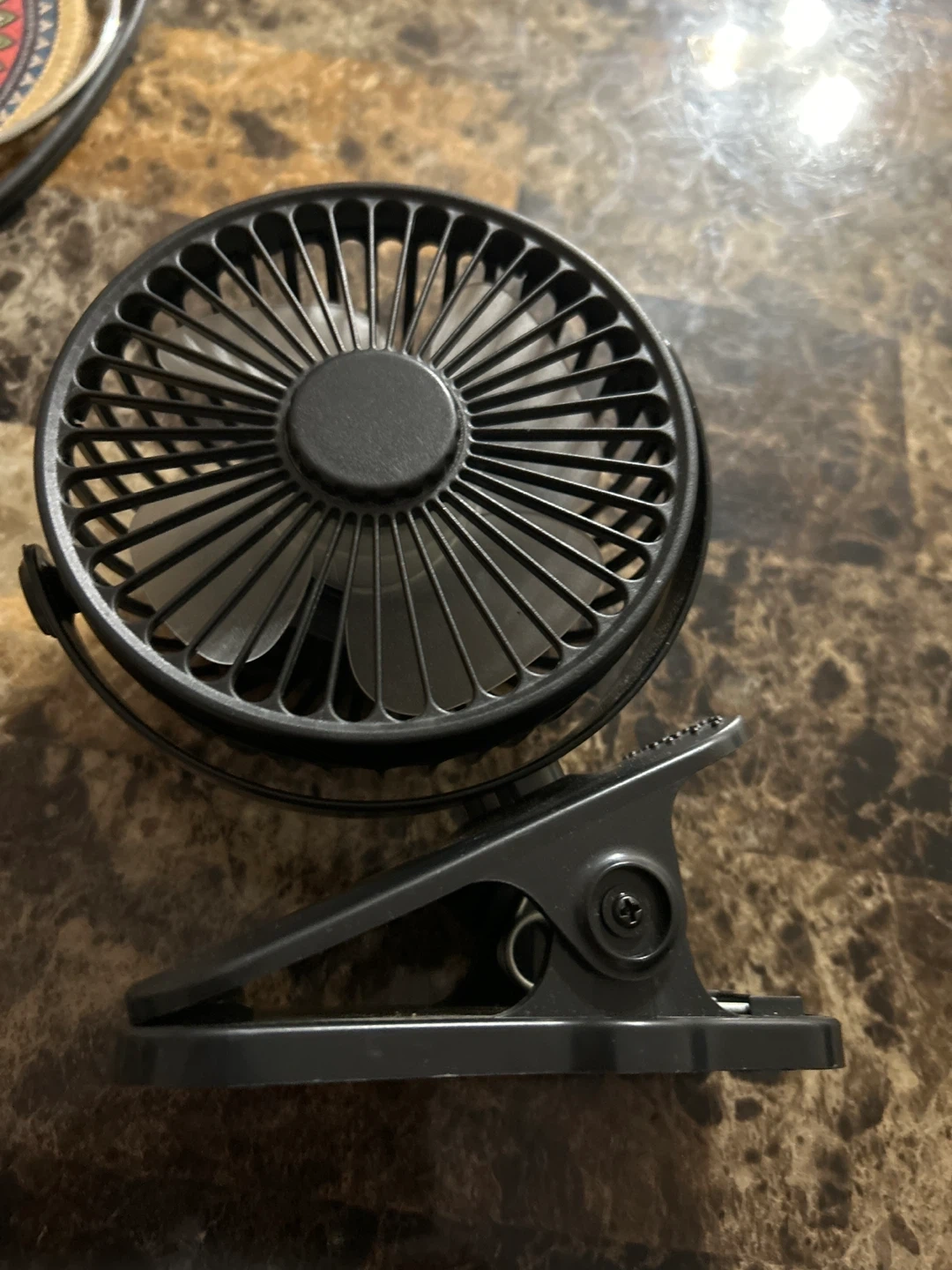 This is a New black clip-on mini USB desk fan. It's powered by USB and has a flexible gooseneck. The clip is strong and attaches to surfaces easily.