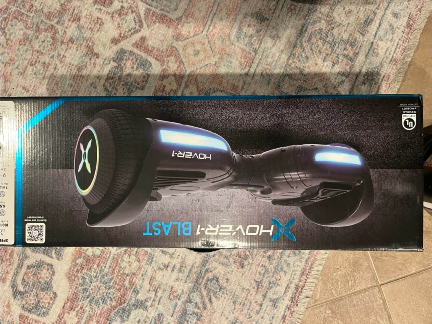 This Hover-1 Blast is a personal electric hoverboard. It has LED front sensor headlights and multi-color wheel lights. Max speed is 7 mph, with a max distance of 3 miles per charge. The max weight is 160 lbs. this item is brand new, has been we been used.