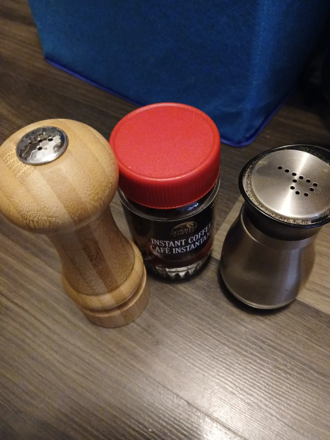 Includes a wooden salt(full) or pepper (empty) Also a jar of instant coffee with a red lid. Great for stocking your kitchen, opened and used once almost full