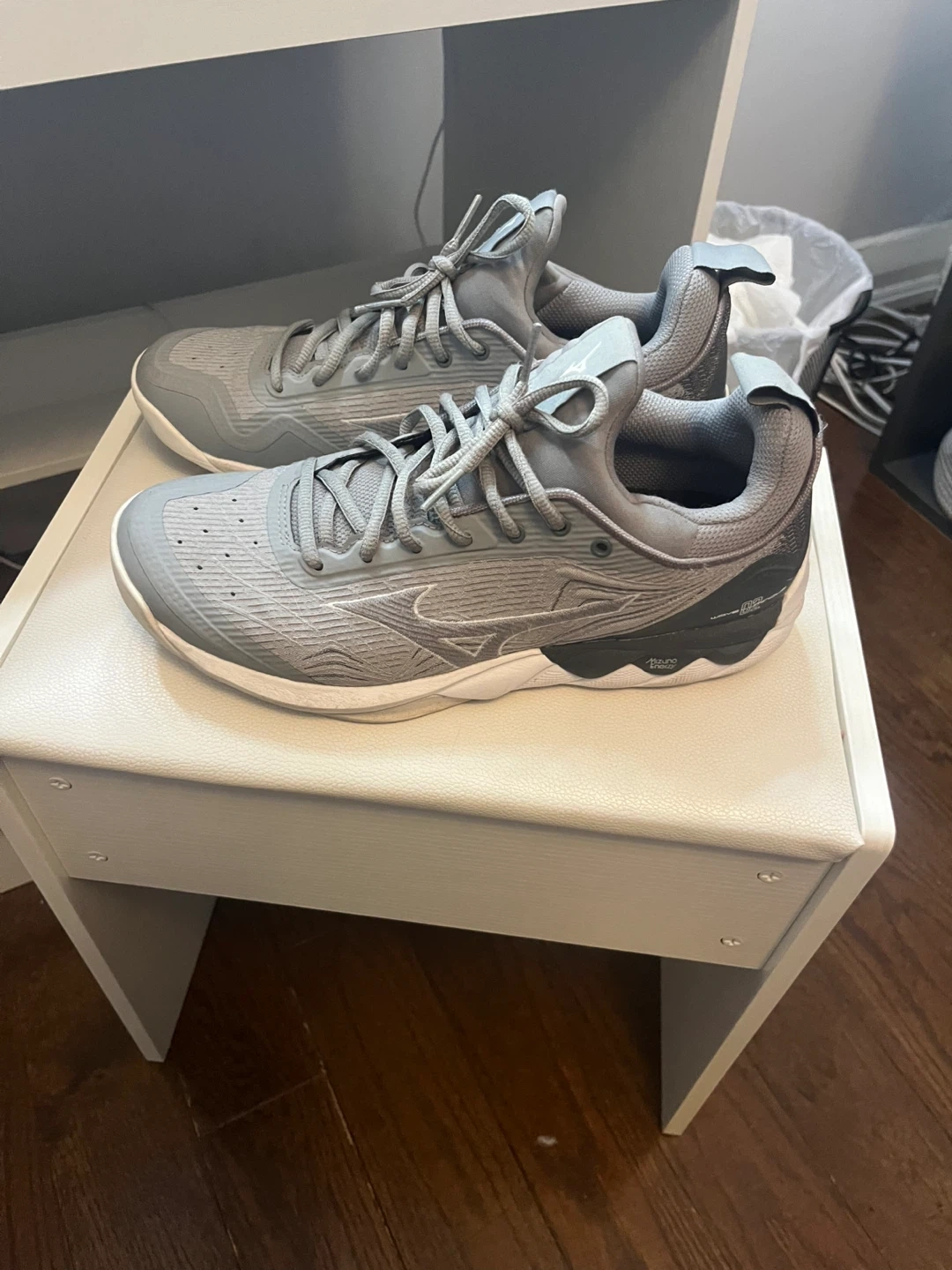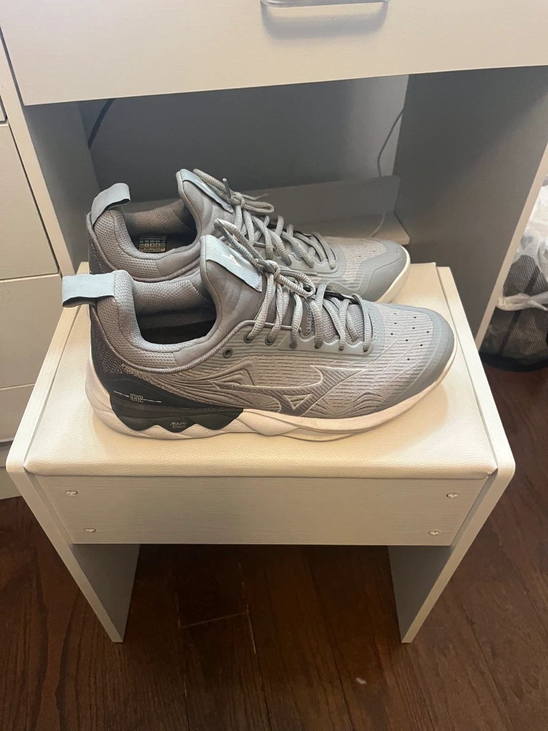 These are Mizuno volleyball shoes in a grey colour. They're designed for athletic performance on the court. The material appears to be a lightweight mesh and synthetic blend.