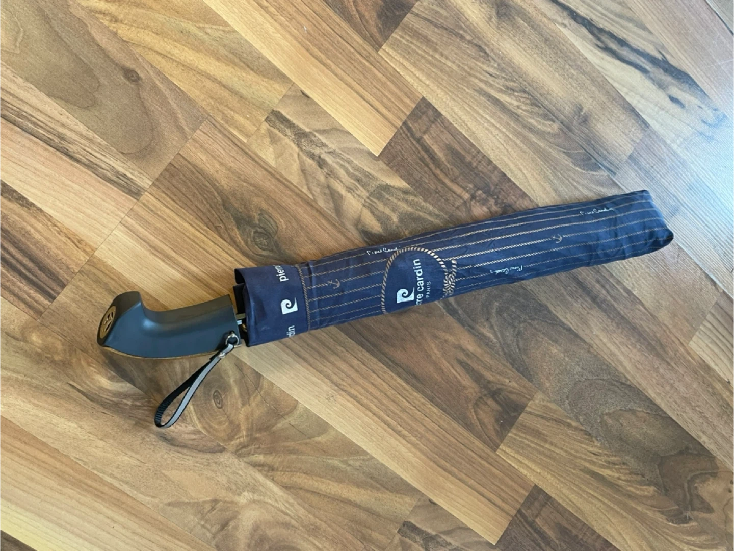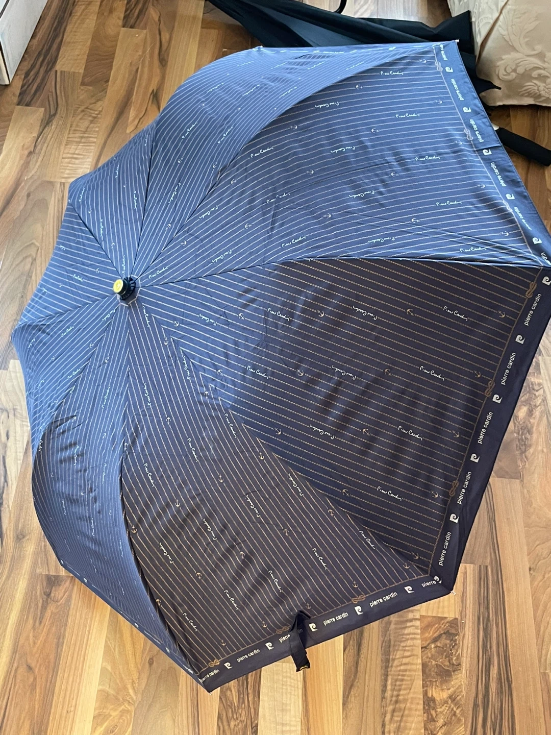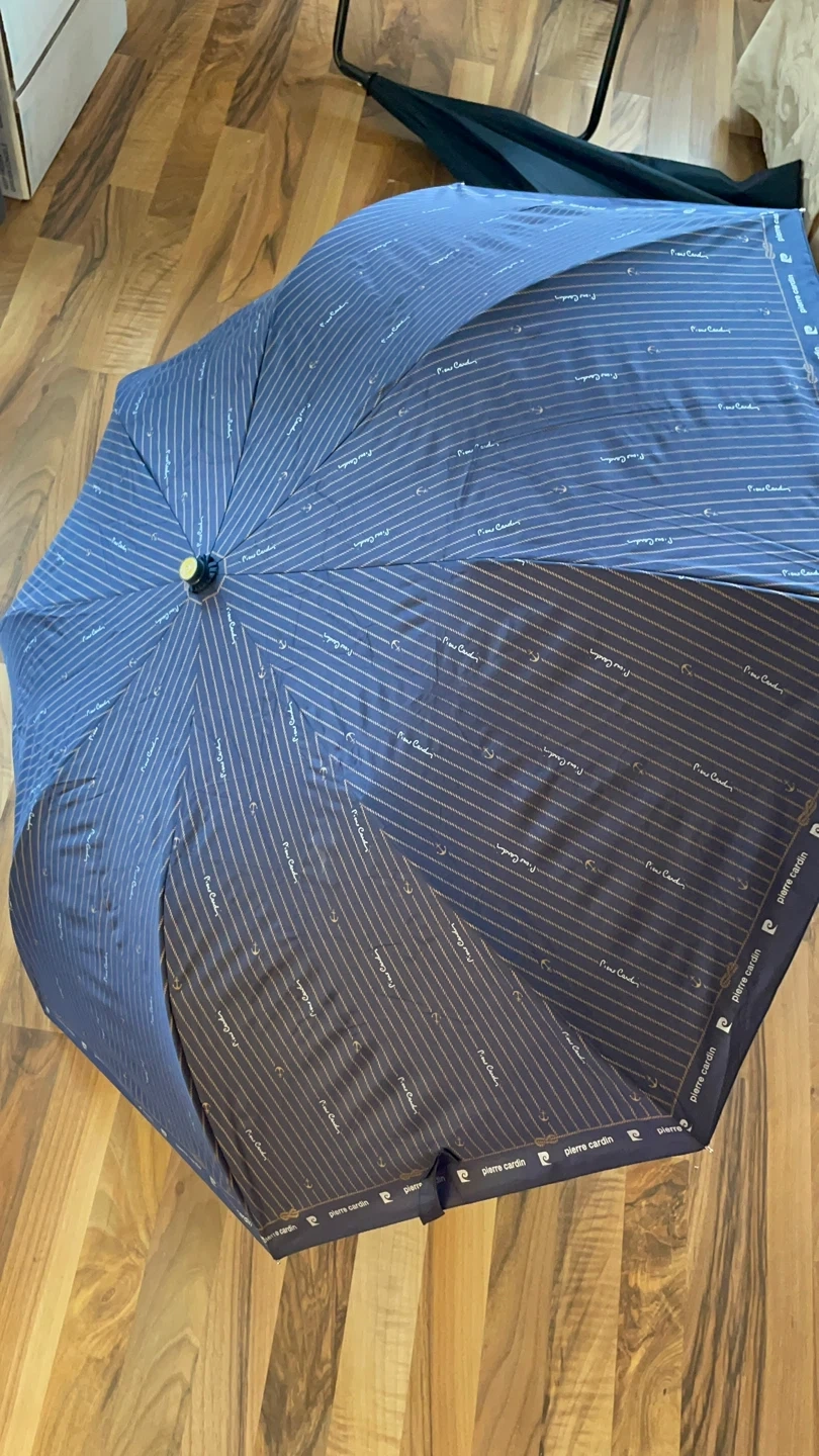 This is a navy blue umbrella from Pierre Cardin. It features a pinstripe pattern with small anchor and signature logos. Includes a matching sleeve for storage.