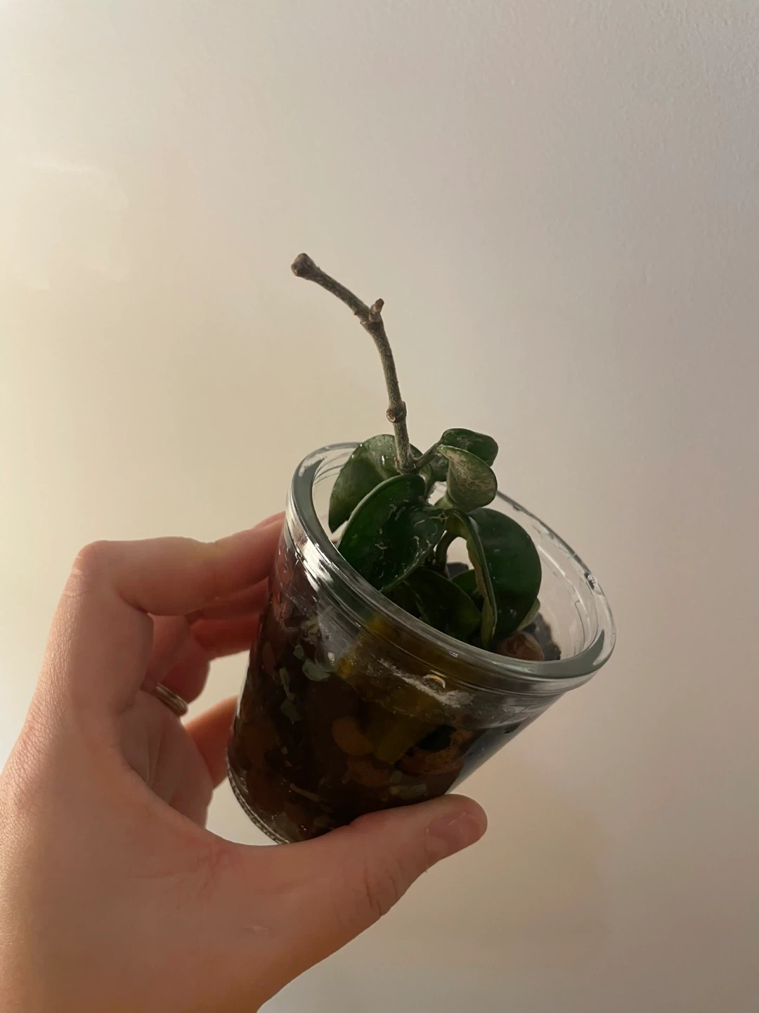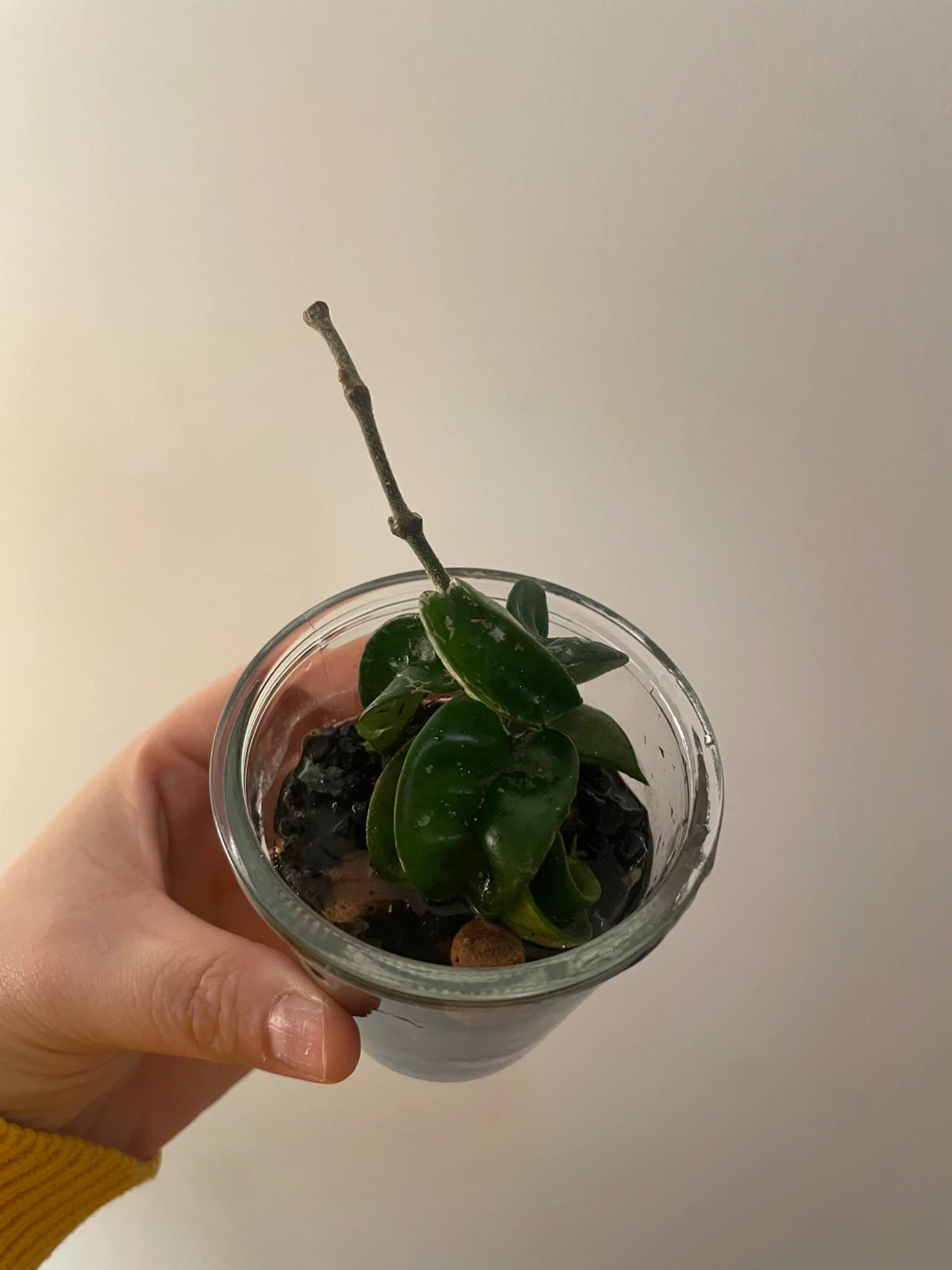 This is a Hoya plant cutting growing in a small clear glass pot. It's a healthy cutting with green leaves and a developing stem. Ready for its new home!