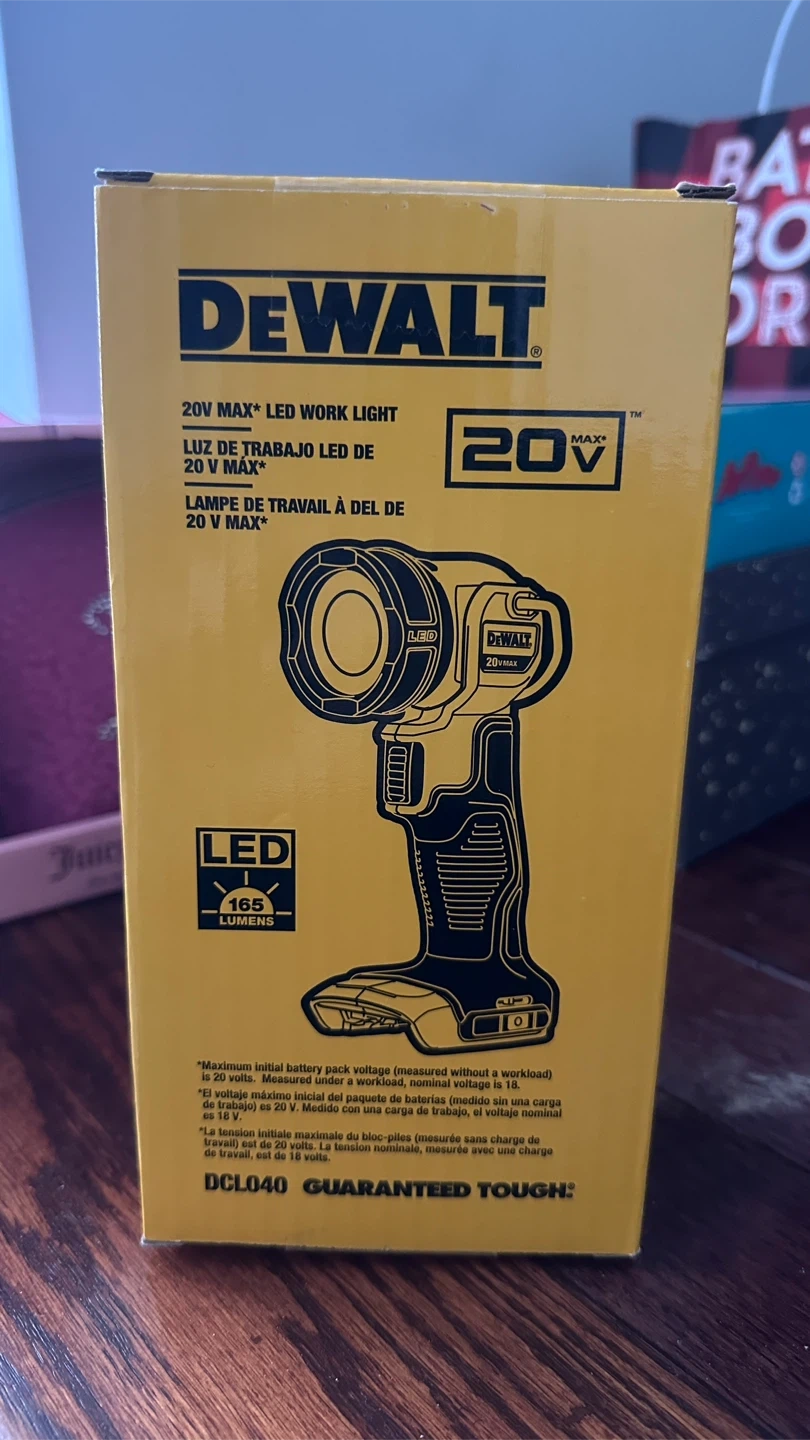 This is a DEWALT 20V MAX* LED work light. It features 165 lumens for bright illumination. The voltage is 20V MAX*. This light is ideal for various work environments where extra light is needed.