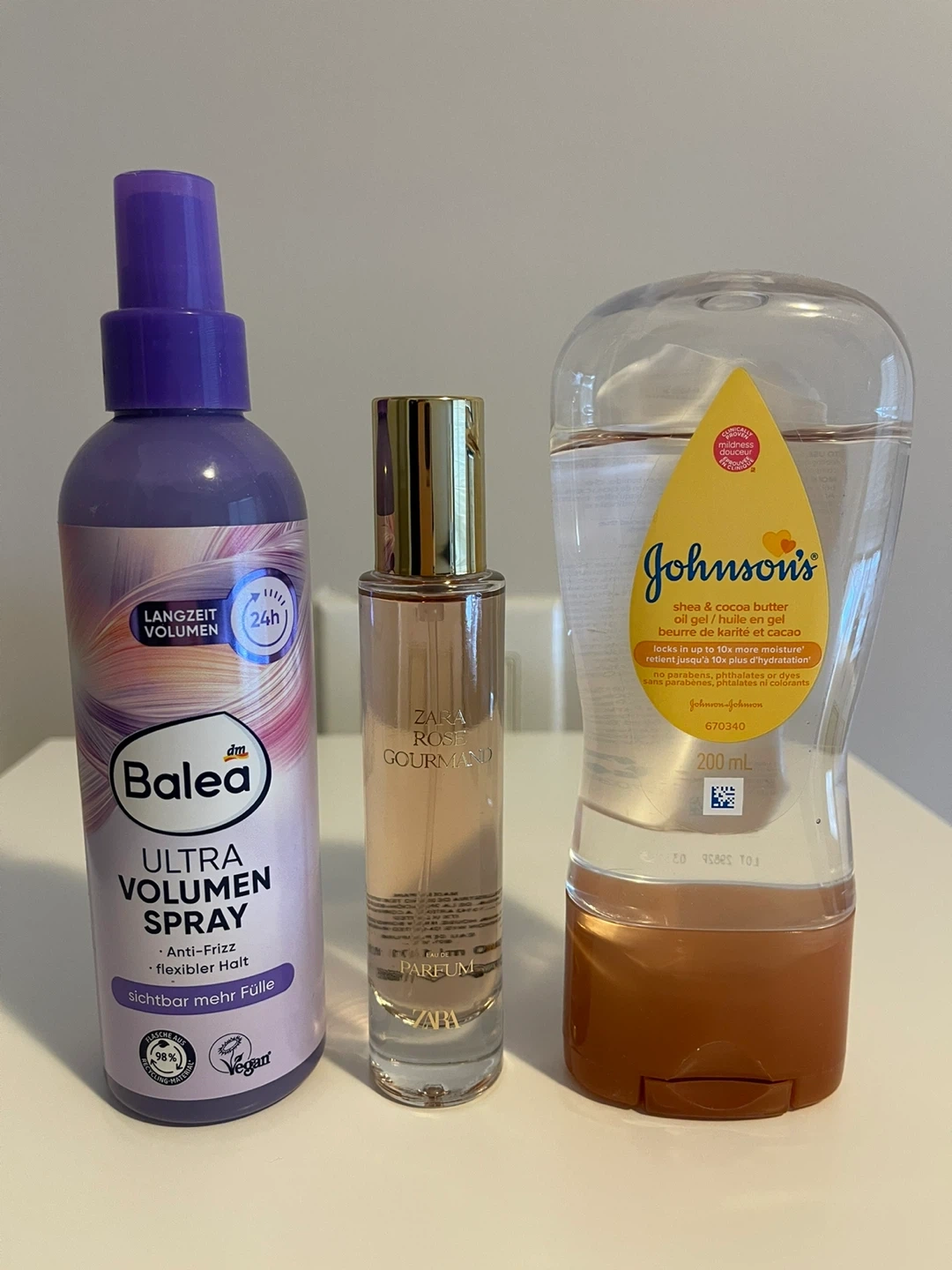 This bundle includes Balea Ultra Volumen Spray for anti-frizz and flexible hold. Also, a Zara Rose Gourmand perfume and Johnson's shea & cocoa butter oil gel, which locks in moisture. The oil gel is 200ml and free of parabens, phthalates, or dyes.