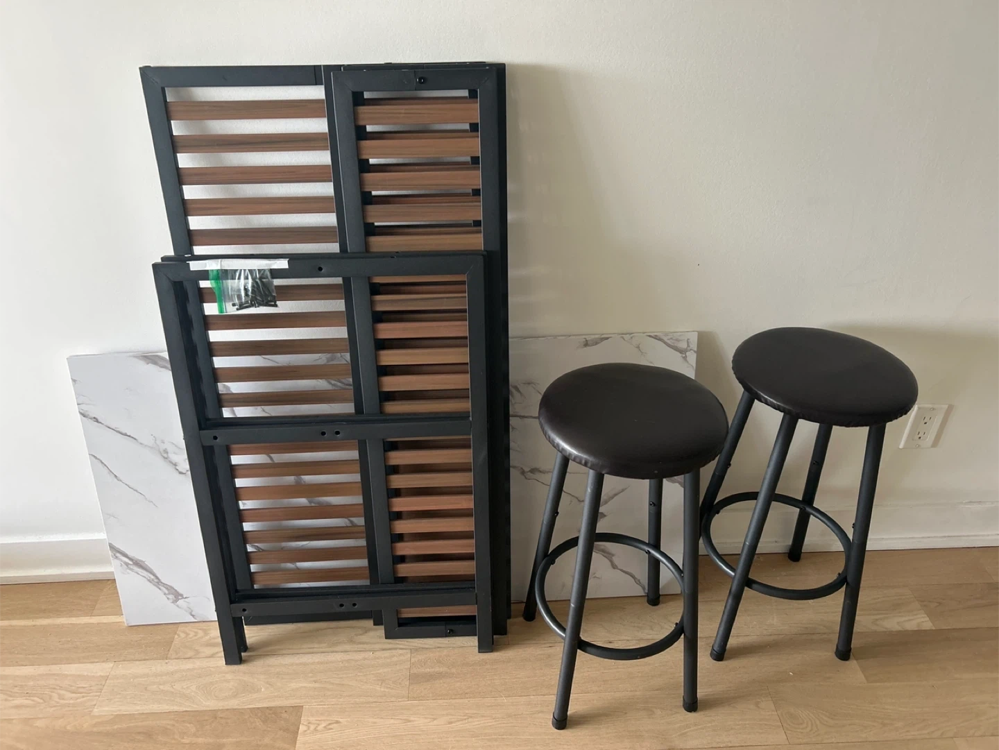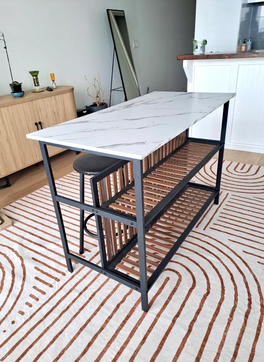 Marble-look countertop and two slatted shelves for storage. Two black stools are included. This setup is perfect for smaller kitchens or apartments needing extra counter and seating space! Very light tables, can be moved according to your needs.