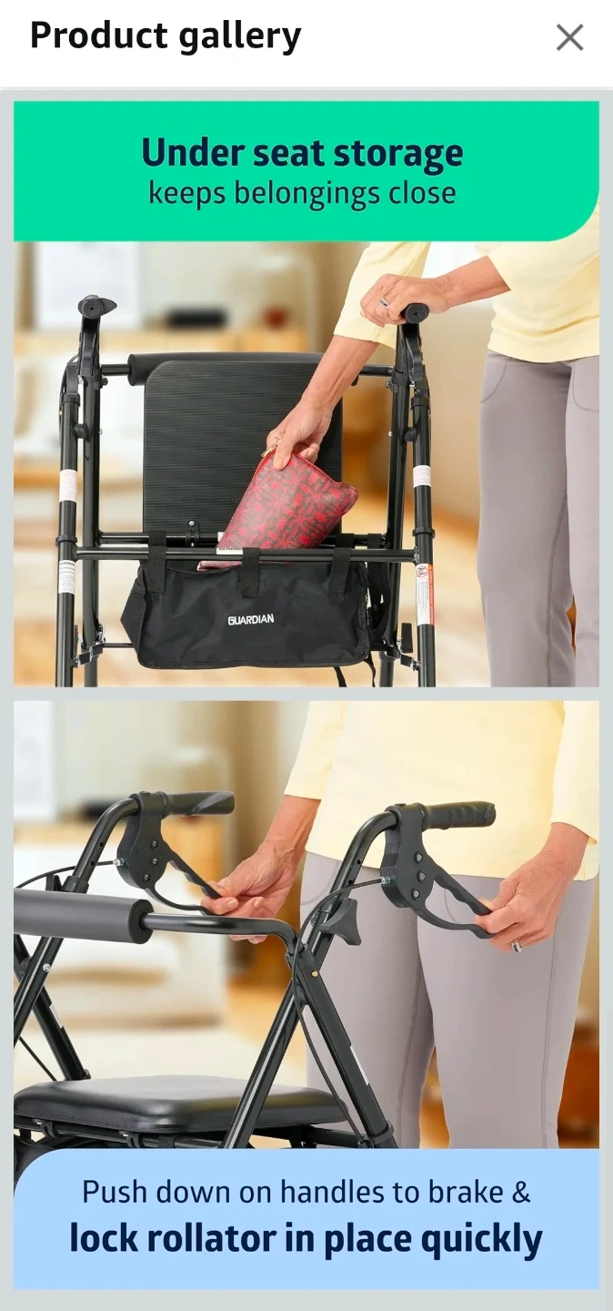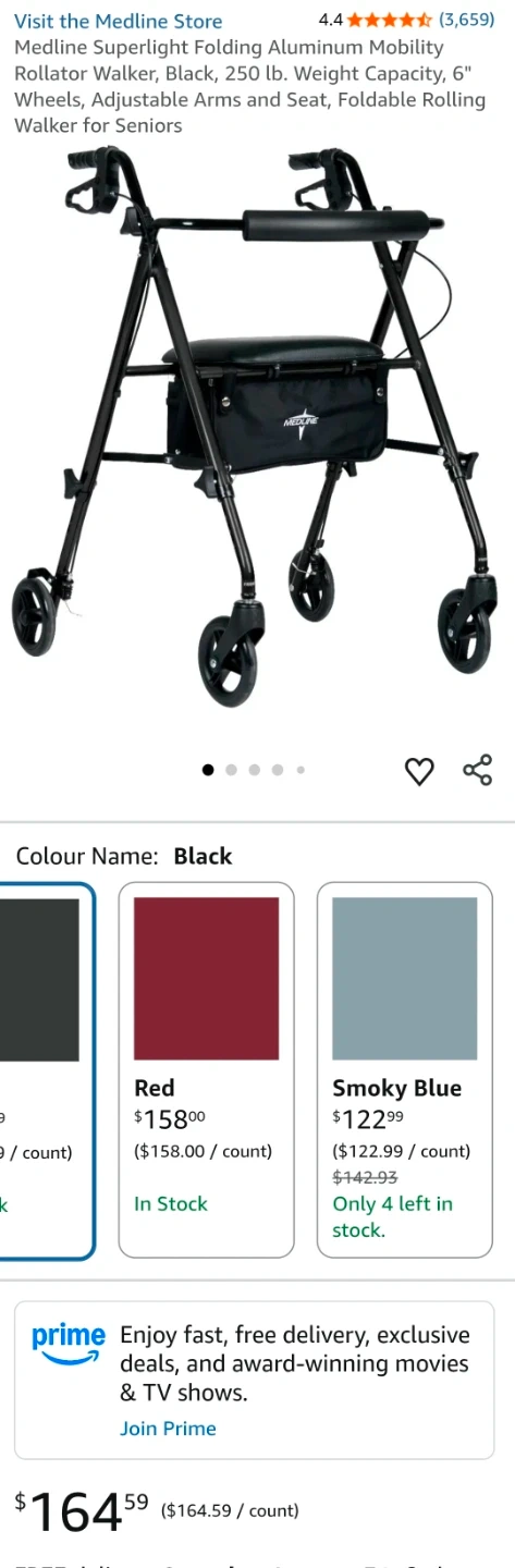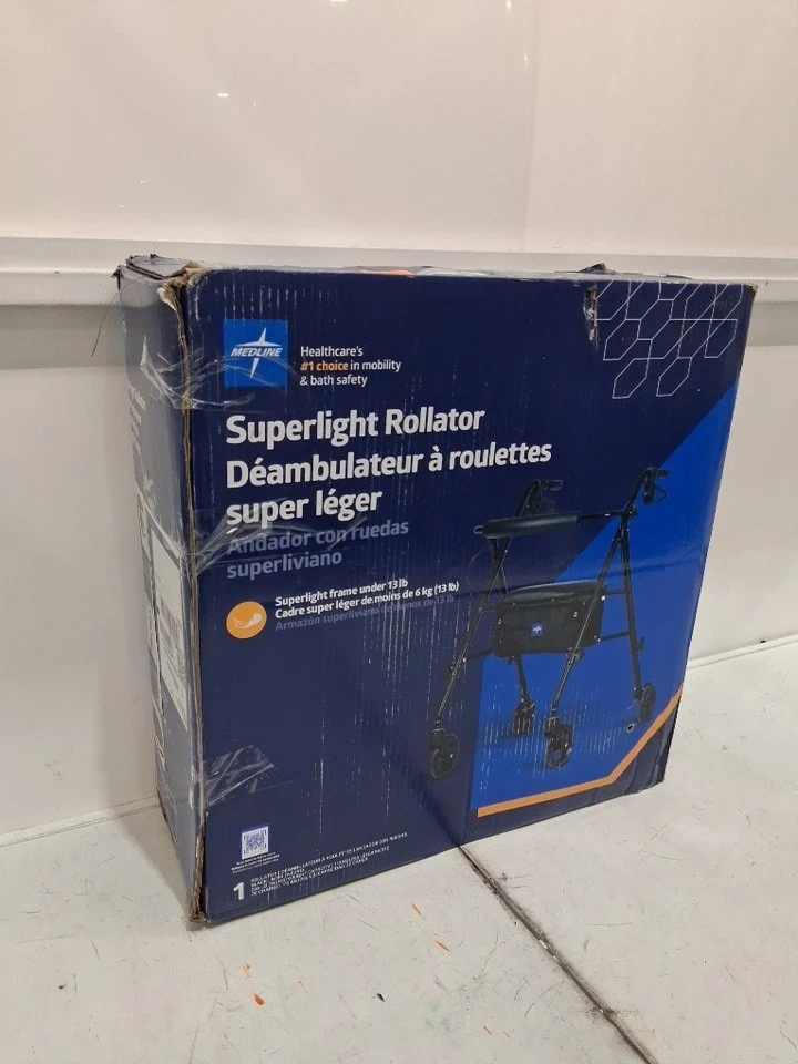 This is a Medline Superlight Folding Aluminum Mobility Rollator Walker, designed for adults. It weighs just 12.6 lbs but supports a weight capacity of up to 250 lbs. It has ergonomic easy-to-use brake handles and height-adjustable seat and handles. The frame is foldable for easy transport.