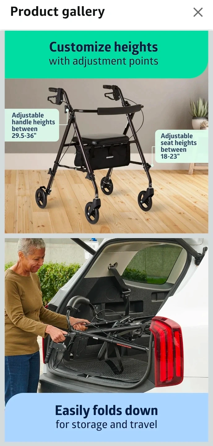 * Height-adjustable seat and handles: 12x12 padded seat adjusts 18-23 from the floor; handles adjust 29.5-36 from the floor